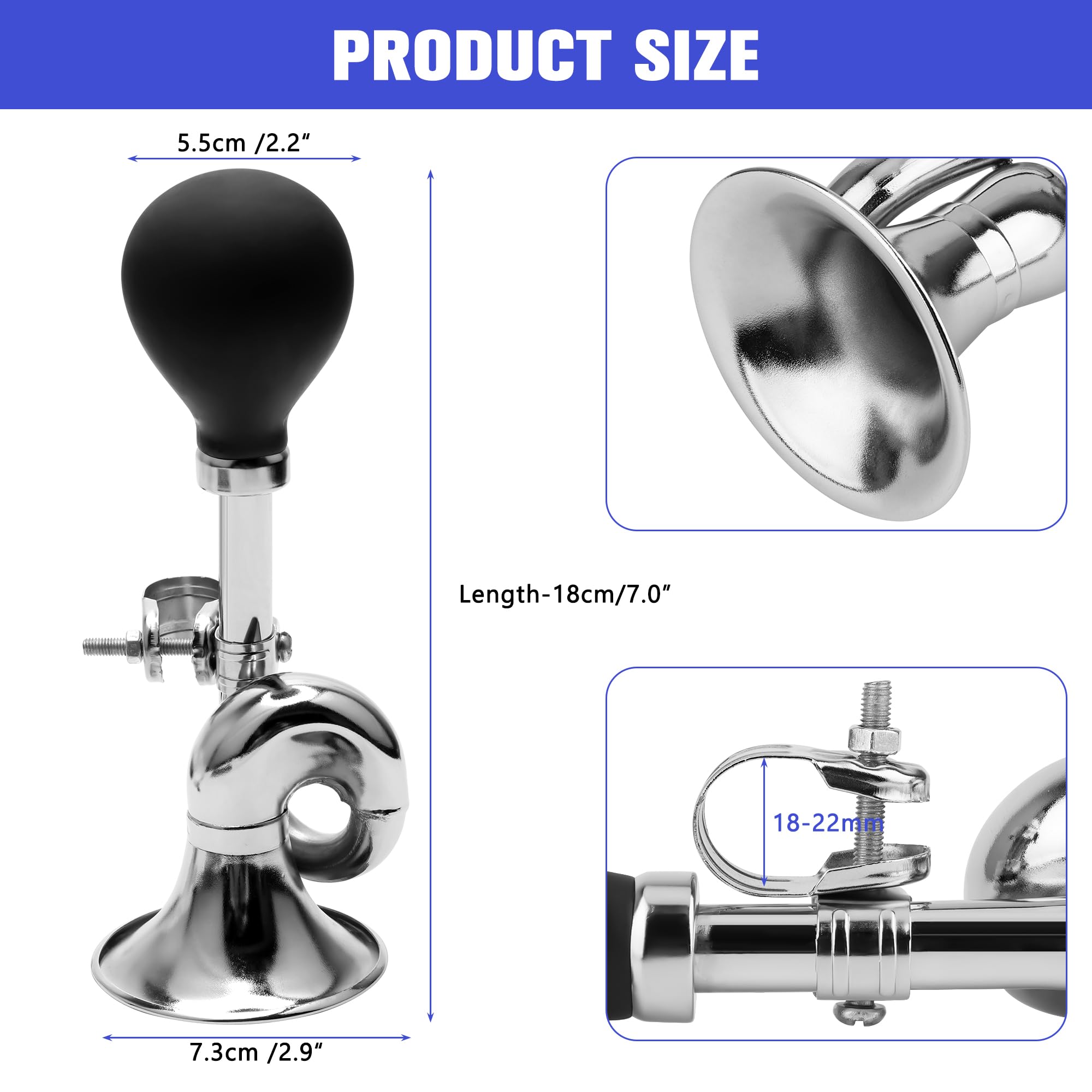 𝐇𝐨𝐫𝐧 𝐒𝐢𝐳𝐞: The bugle horn length is 18cm(7.0"); Horn ball diameter is 5.5cm(2.2"); Metal mouth is 7.3cm(2.9"). Mounting dimensions: Handlebar diameter is 18- 2.22 cm(0.7-0.87").