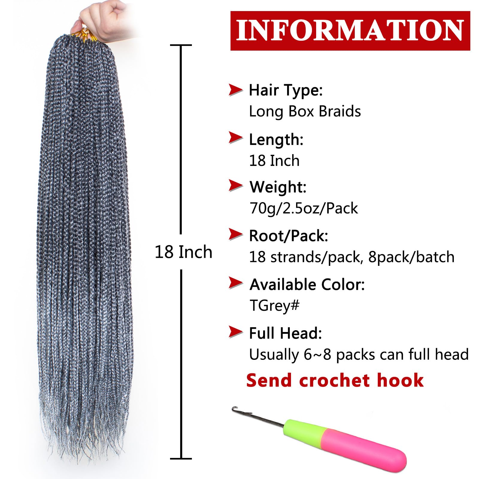 Packaging: Box braids crochet hair is 18 inches long, 18 strands/pack, 8 packets/lot, 144 strands/lot, generally enough for a complete head, also with a crochet needle.