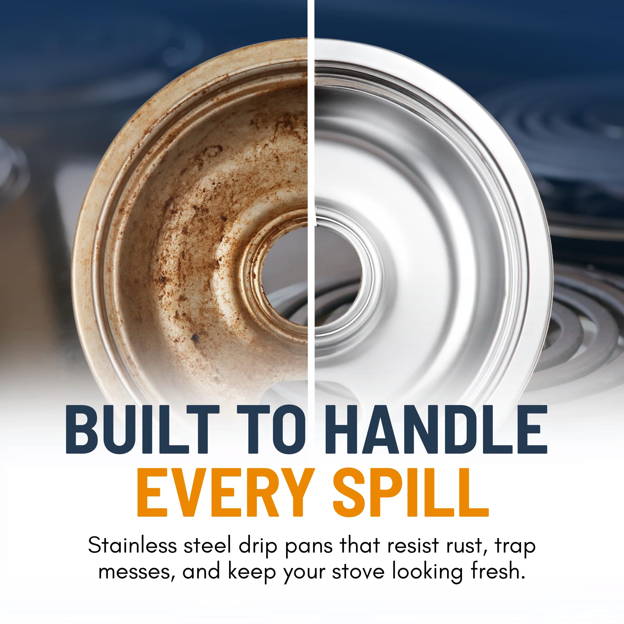 DURABLE & COST-EFFECTIVE UPGRADE - Built from heavy-duty steel with a polished chrome finish, our stove top drip pans resist warping, discoloration, and corrosion to handle everyday cooking with ease. Instead of replacing your entire stove, simply swap in new drip bowls for electric stove for a cost-effective upgrade that restores both function and appearance.