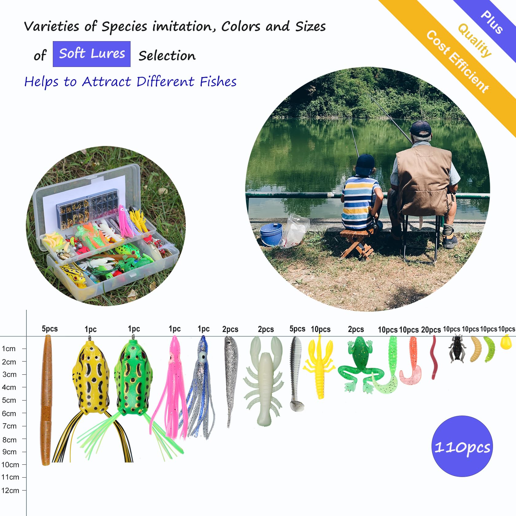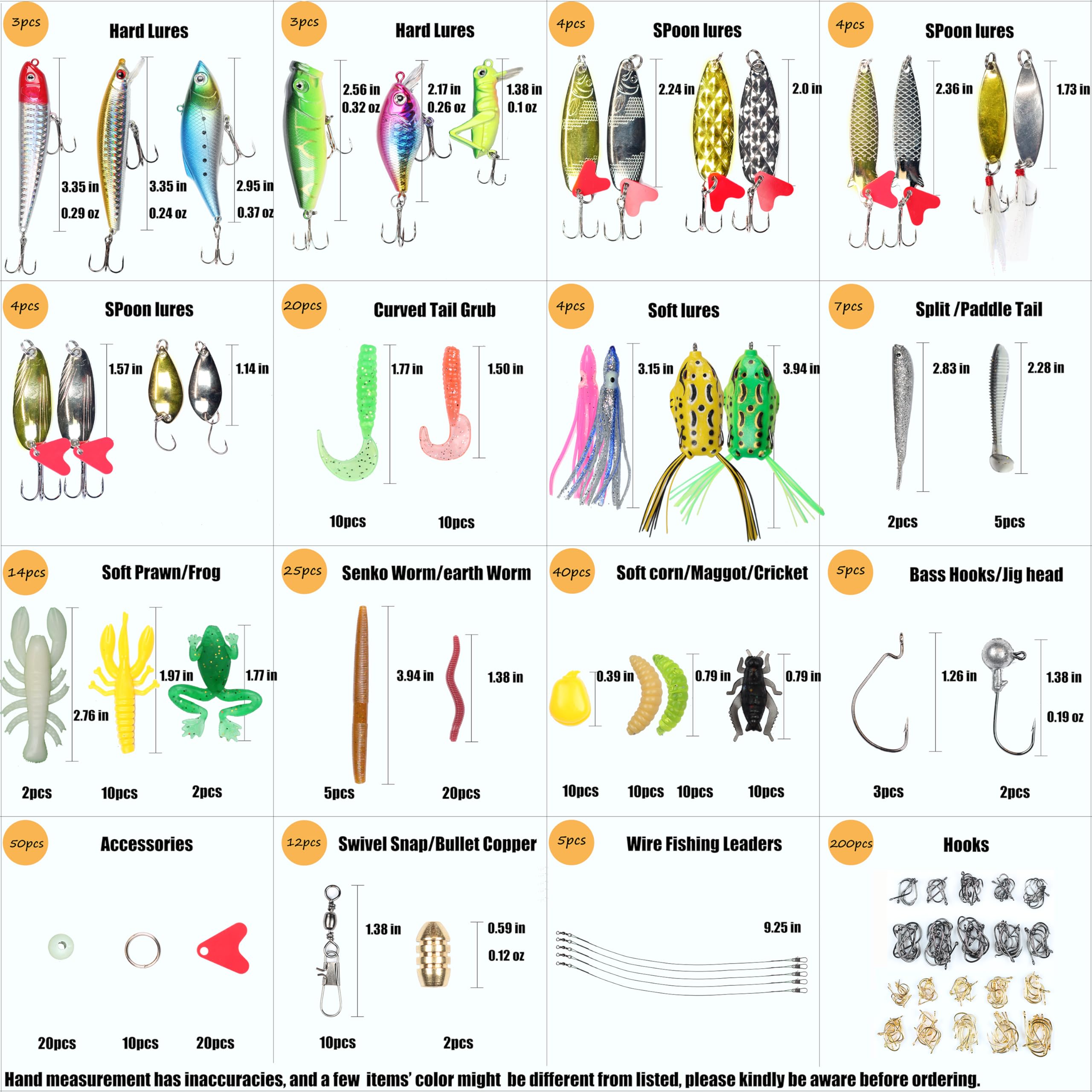 Various fishing baits: a 399pcs fishing lures set tackle box with all the necessary items, includes: 1 Crankbait, 1 Popper, 1 Pencil, 1 Minnow, 1 VIB, 1 grasshopper,12 Spoons, 20 Curved Tail Grabs,2 octopuses,2 big frogs,2 split tail fish,5 paddle tails,12 plastic shrimps, 5 Senko worms,20 earthworms, 10 corn kernels,20 Maggots,10 crickets, 3 hooks, 2 jigs,20 fishing beads, 10 rings, 20 plastic sheets, 10 swivel snaps, 10 thread bullet coppers,5 wire fishing leaders and 2 tackles hooks.