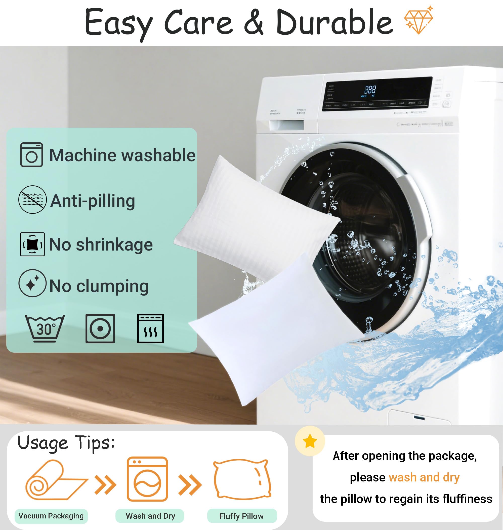EASY CARE: Machine washable and tumble dryable; no shrinking, pilling, and clumping, sun-cure your pillows regularly to keep them fluffy