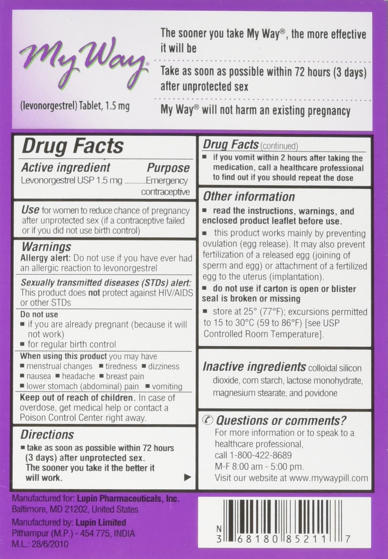 Active Ingredient: Levonorgestrel 1.5mg Inactive Ingredients: colloidal silicon dioxide, pregelatinized starch, lactose monohydrate, magnesium stearate, and talc