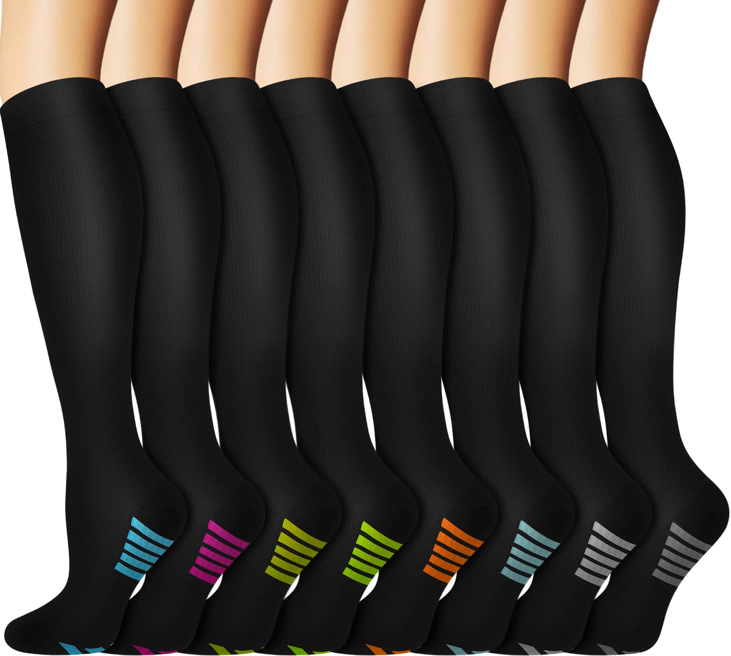 COPPER COMPRESSION SOCKS - 8 pairs of quality socks with unique color combination,it is perfect for 8 working days without daily wash, Through our socks, we are extending its natural property to rejuvenate blood circulation through your legs through copper fibers capable reviving blood circulation along with providing a 15-20 mmHg compression.