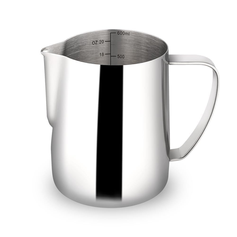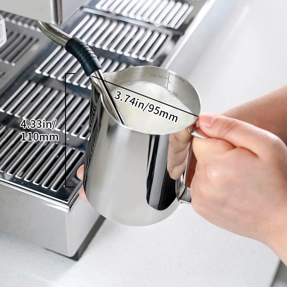 ☕ 【INSIDE SCALE LINES MEASURING】The milk pitcher has clear inside measurement lines(ml/oz), making it easier to control the amount of milk or cream per cup of coffee. 12oz/20oz milk frother pitcher can satisfied your different demands. Ideal for foaming or steaming milk, used in espresso and cappuccinos, it can be used for any liquid measuring like water, juices, batter mixes, smoothies etc.