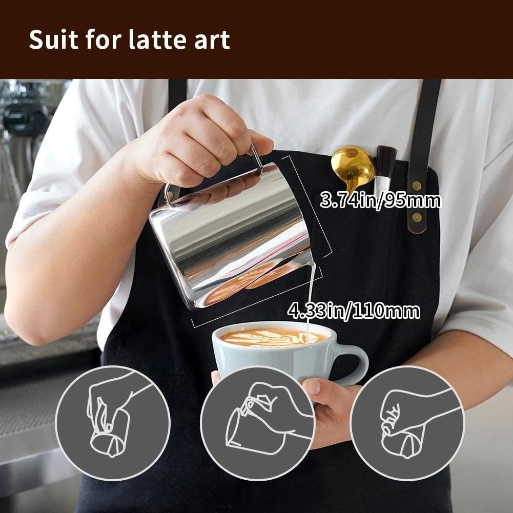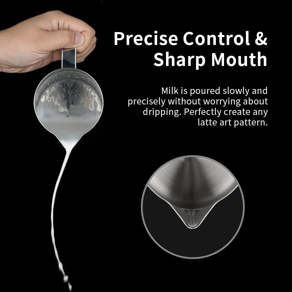 ☕ 【DRIPLESS SPOUT & Precise Control】The dripless spout allows you pour milk foam smoothly and precisely without dripping. The curved pouring spout can easily separate the foam from the liquid. You can practice and create your own beautiful latte artwork easily!