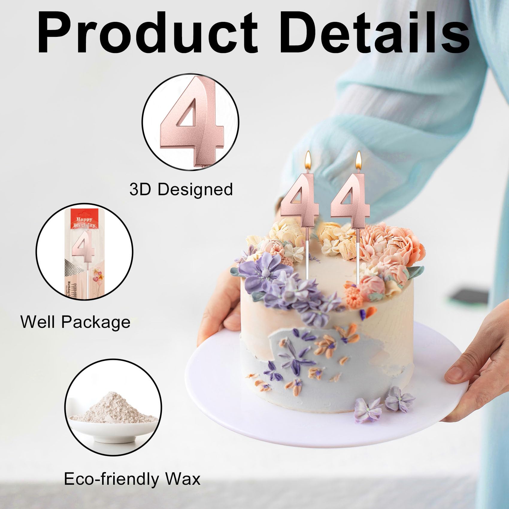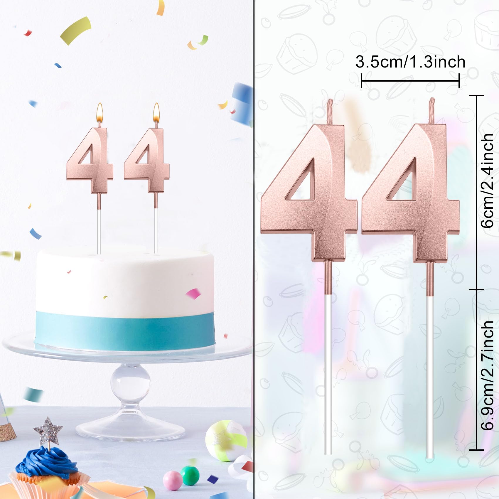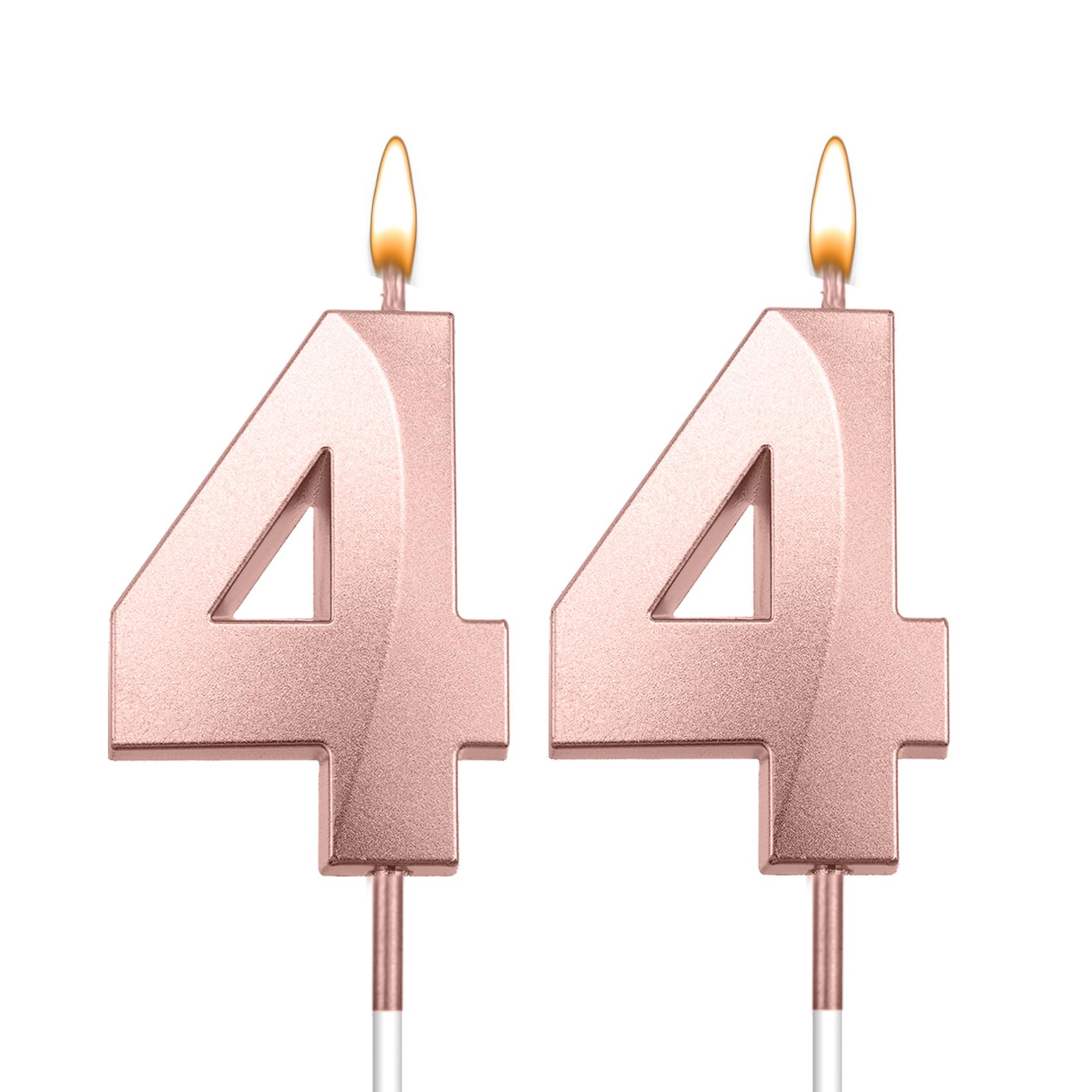 Vibrant 3D 44 candles for cake: Package contains two matte-rose gold birthday candles for cake —featuring 2 Pcs number 4 candle —that together form a sparkling "44" " display. In low lighting, 44 cake topper add a elegant glow, making them perfect for decorating cake, cupcakes, and desserts. A wonderful way to help create memorable birthday moments. number birthday candles 44th birthday gifts for women 44 birthday decorations for him happy 44th birthday party favors