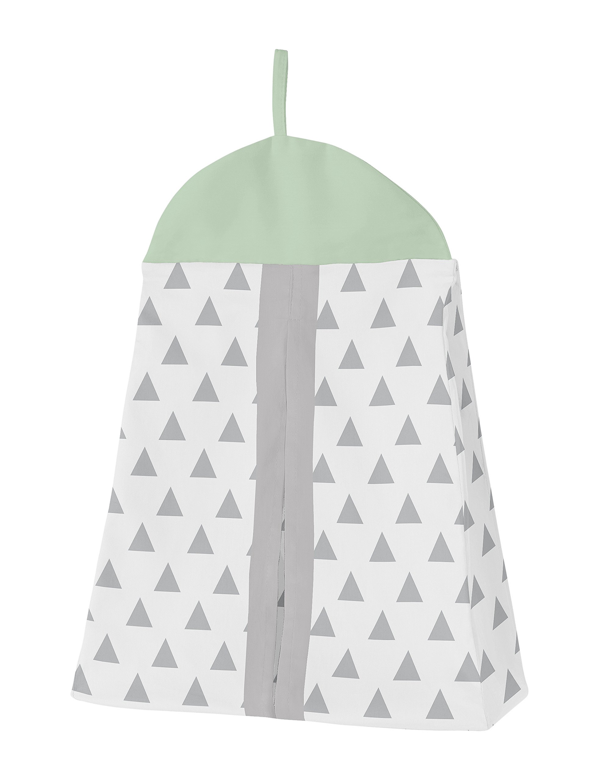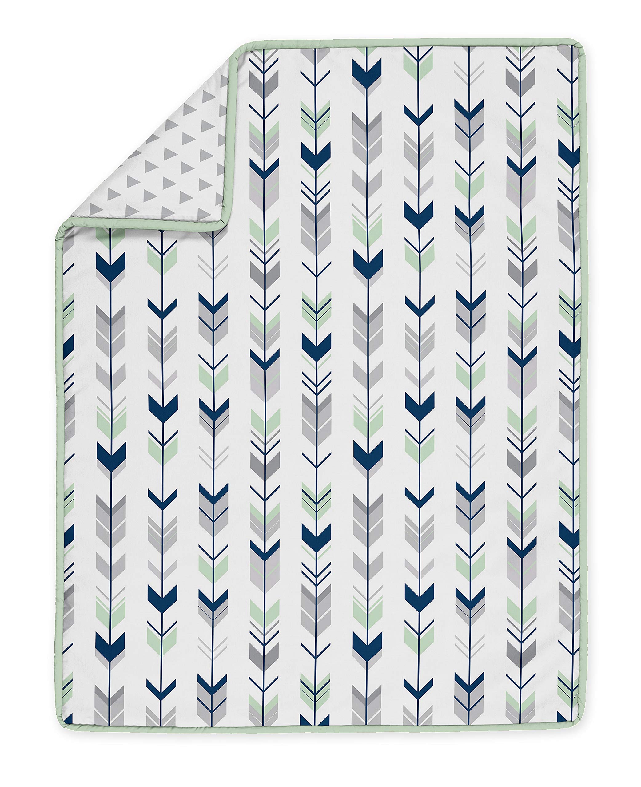 This crib bedding combines a multi-colored arrow print, a coordinating triangle print, and solid mint and grey fabrics