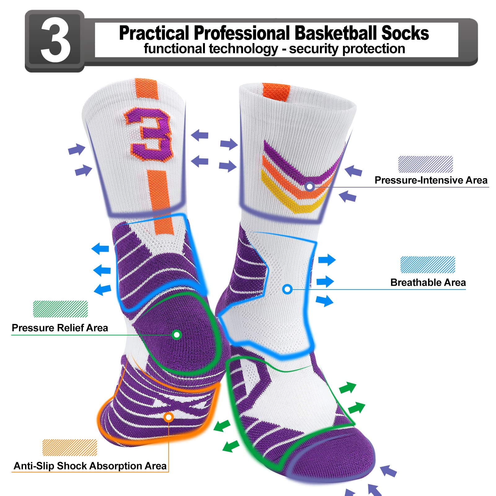 Size Range - Taking into account the foot size of children and adults, our basketball socks are suitable for boys with a size of 1.5 inches to 5.5 inches feet, while the size for men is 5.5 inches to 11.5 inches. Please pay attention to the size selection before buying, but because our athletic socks have super elasticity, if you have a pair of larger feet, it may also suit you.