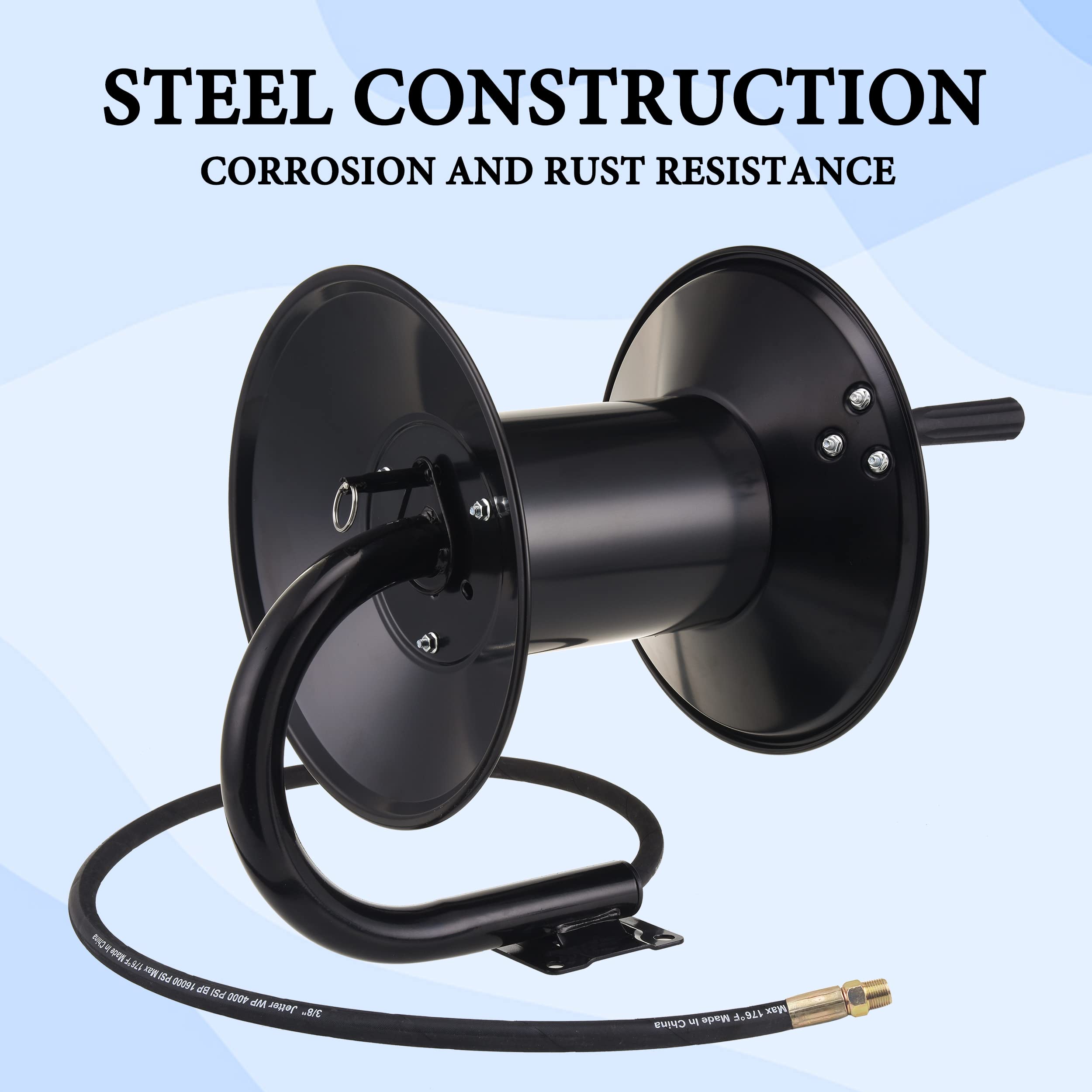 Specifications of Pressure Hose Reel: Max PSI: 4000 PSI; Max Temperature: 176°F; Thread: NPT 3/8"; Capable of holding 150 feet hose (NOT INCLUDE 150FT HOSE), 80 inch inlet pressure hose is Included. Compatible with 3/8" NPT male end and M22 female end.