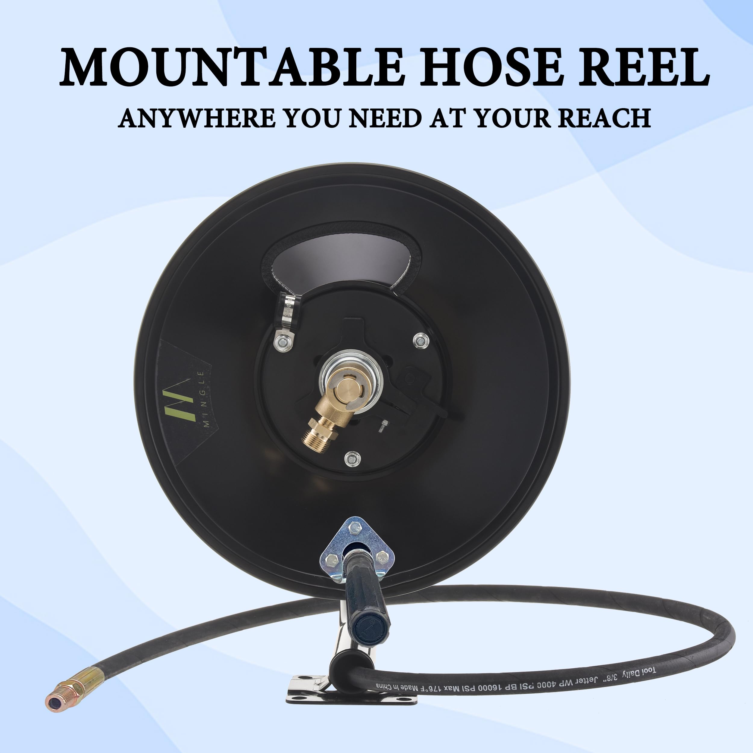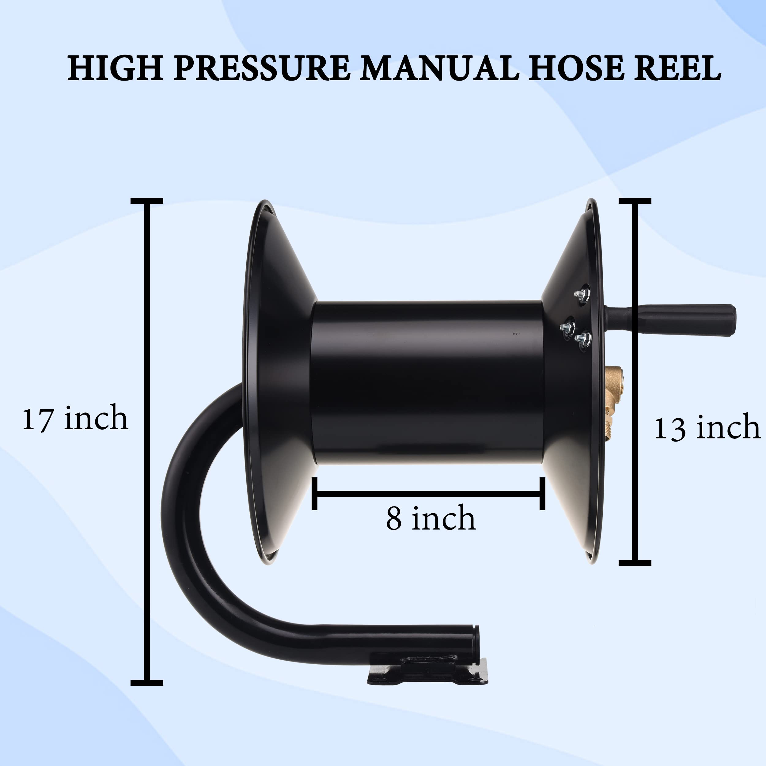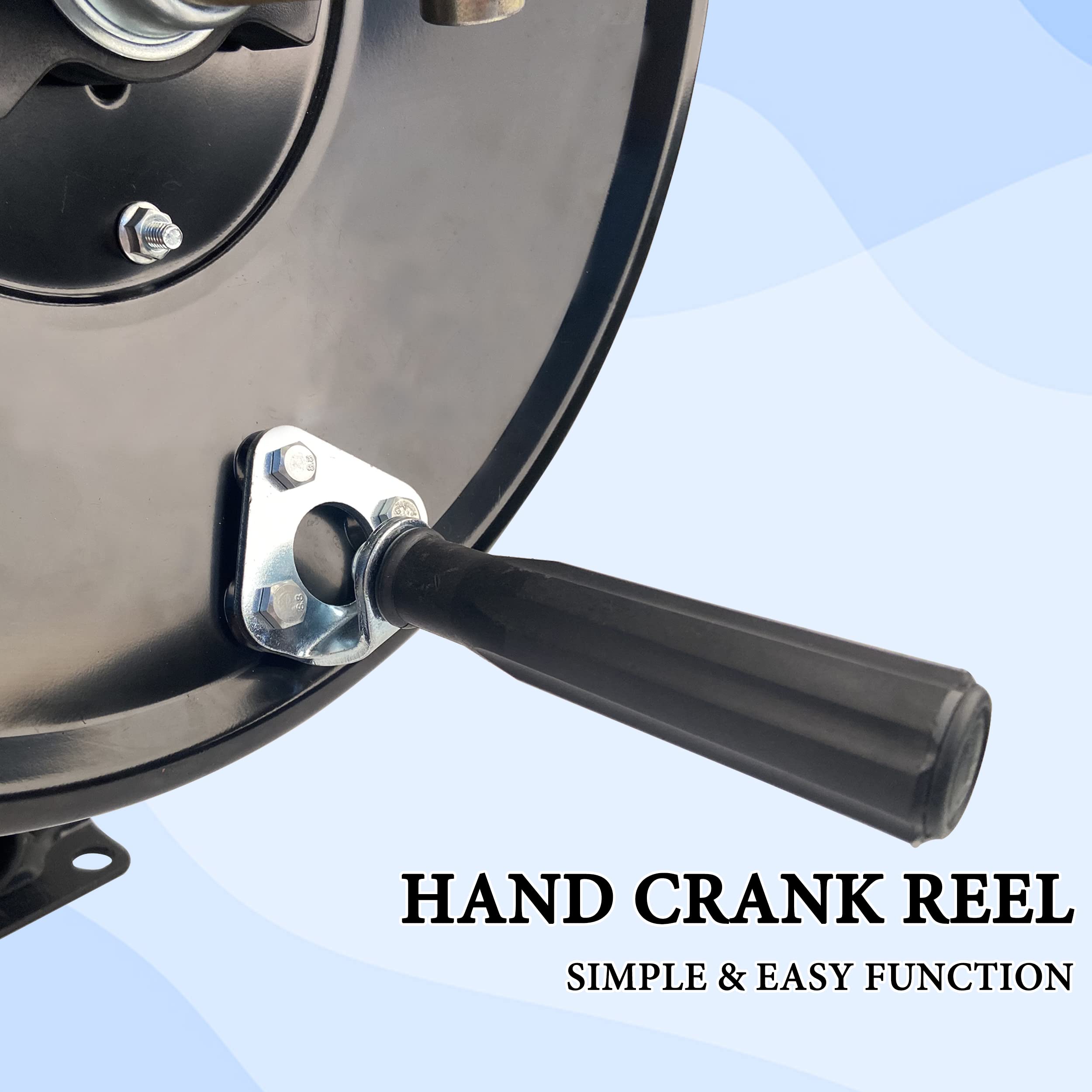 Hand Crank Hose Reel: Direct hand-crank rewind designed pressure washing hose reel with swivel and smooth round handle, easy to put away your power washer hose. Brass swivel and internal stainless-steel stem prevent power hose tangling and resist rust and corrosion. Pressure washer 90 degree elbow preserves hose lifespan and protects from kinks and bend damage.