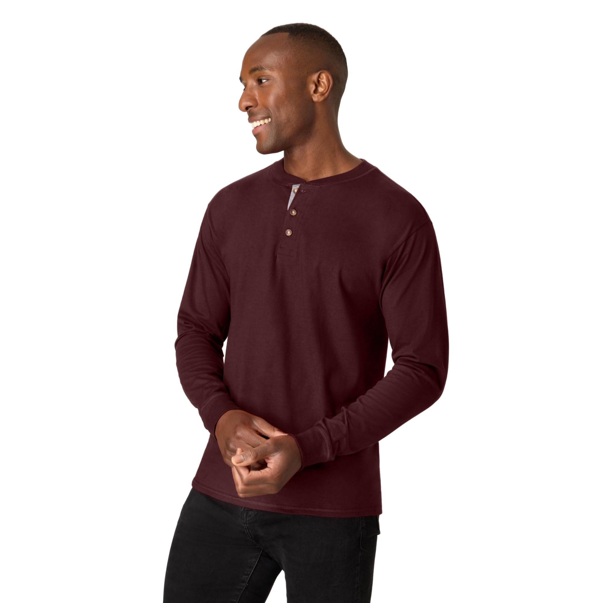 HENLEY STYLE - These Hanes men's cotton t-shirts boast a rounded neckline, three-button placket, and long sleeves.