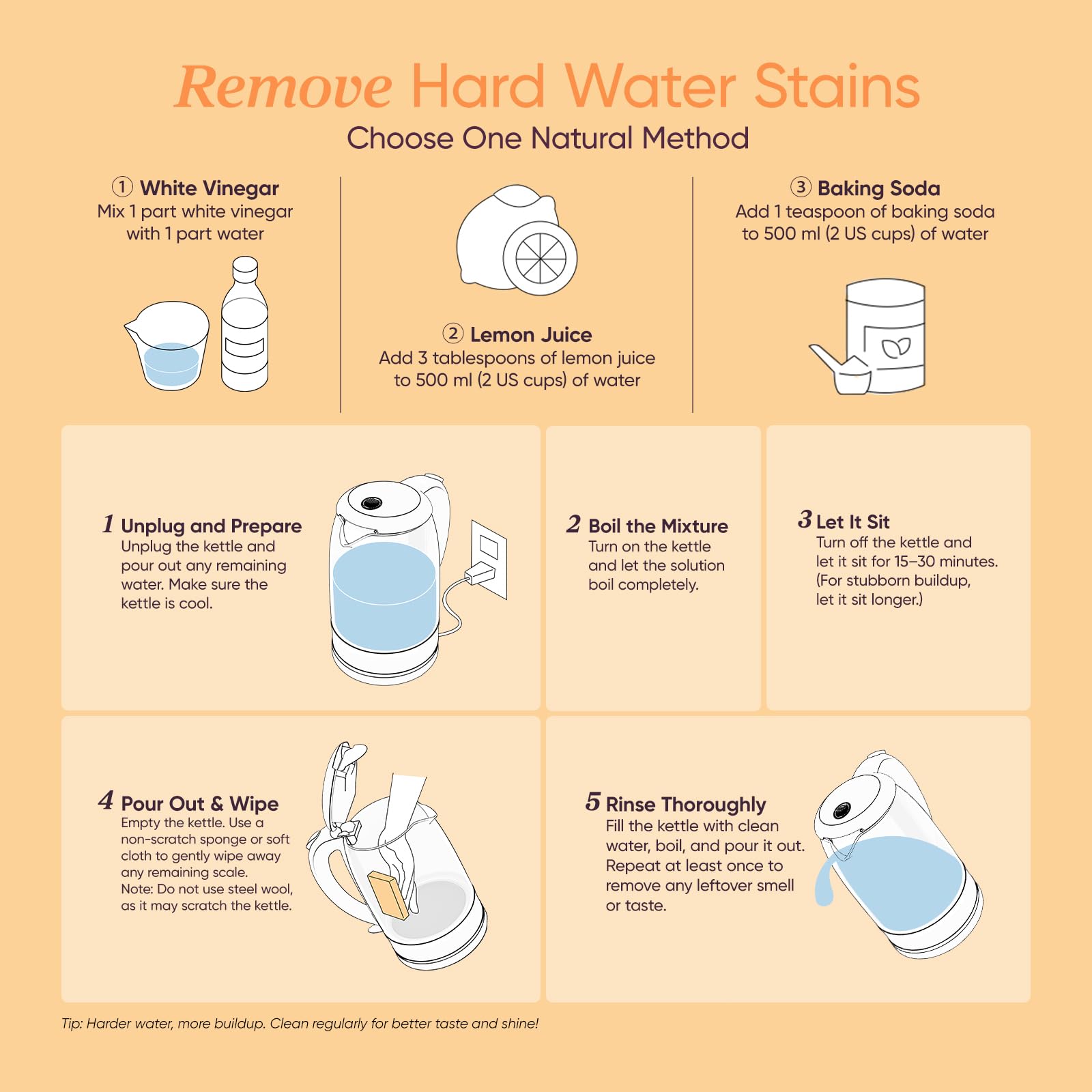 How to Descale/Clean the Kettle? 1. Filling the kettle with 1 cup of vinegar or lemon juice and 2 cups of water. 2. Boiling the liquid and leave it for 2 hours, then use a cloth to clean and wipe. 3. Rinse the kettle with clean water, and dry with a soft, clean cloth. 4. Repeat as needed. Product Size: 9.0"L x 6.3"W x 10"H Notes: It's normal if your kettle exposes spots or rust on the stainless steel bottom after the first use if the water quality in your area is so hard.