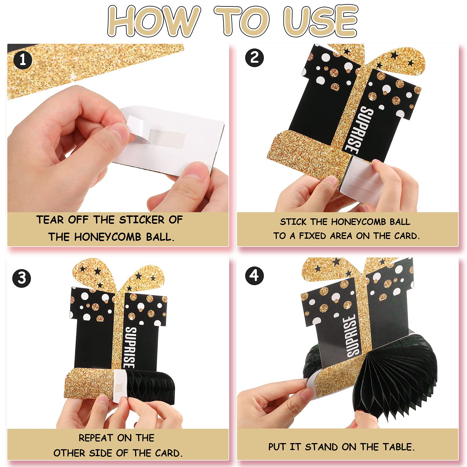 How to use: firstly, tear off the sticker of the honeycomb ball, and then stick the honeycomb ball to a fixed area on the card, next step is repeat on the other side of the card, finally put it stand on the table, they very easy to use and save a lot of time in decorating