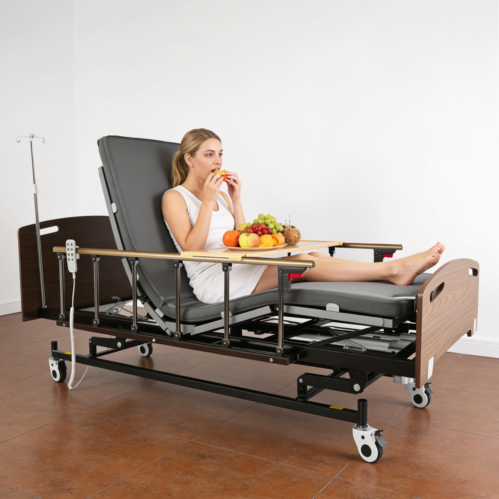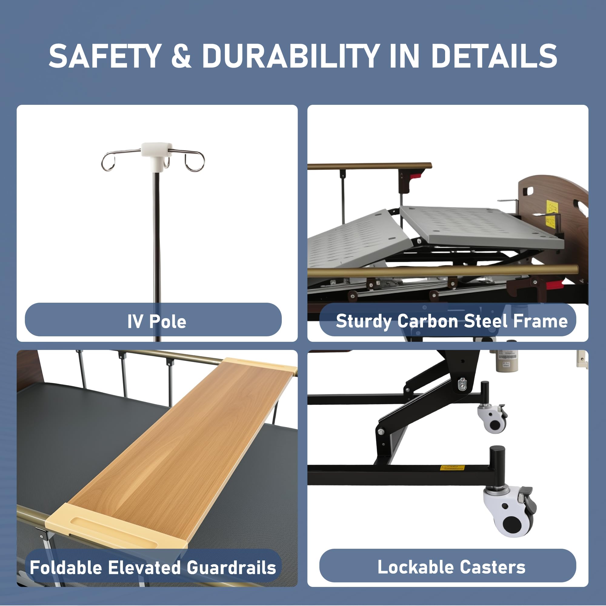 Safety Guard Design: Sturdy and adjustable side rails help prevent falls and provide reliable support, featuring easy folding when not in use for unobstructed bed access. Meanwhile, 4 lockable casters keep the medical care bed securely in place, preventing unintended movement.