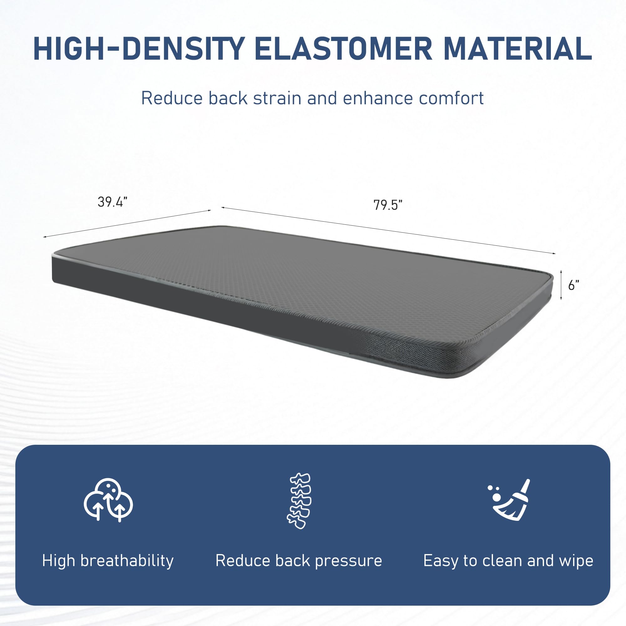 6" Breathable & Washable Mattress: The Zygenair home medical bed features an air-fiber mattress made from TPEE material, offering exceptional support and sag resistance. This highly breathable mattress is washable, deformation-resistant. SIZE: 79.5" L × 39.3" W × 6" Th.