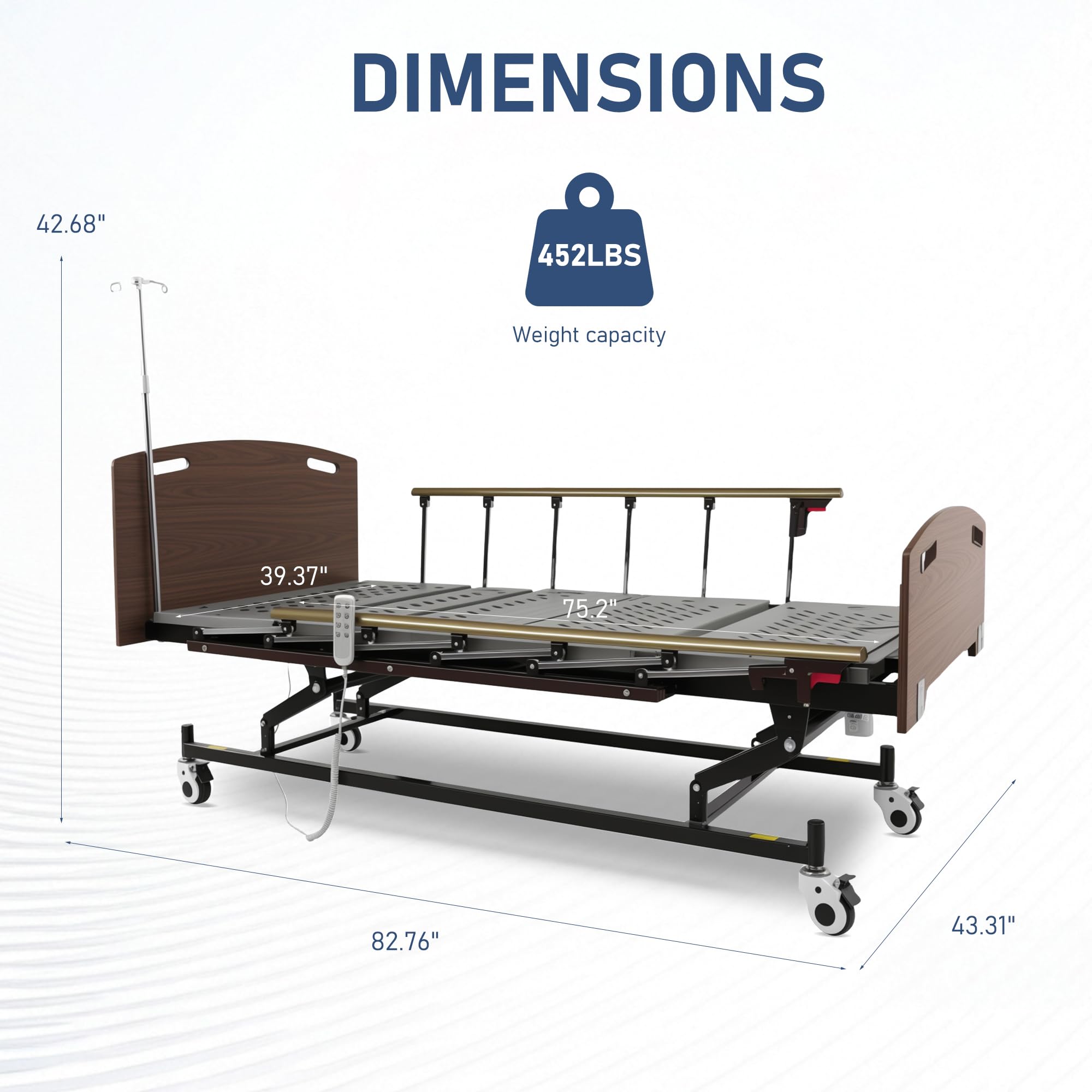 Weight Capacity & Easy Assembly: Our household nursing bed measures 82.76"x 43.31"x 42.68" and supports a maximum weight capacity of 452 lbs. This electric bed is design with detailed assembly instructions, ships in 2 boxes, and is ideal for home care, hospitals, nursing homes, rehabilitation centers, and assisted living facilities.