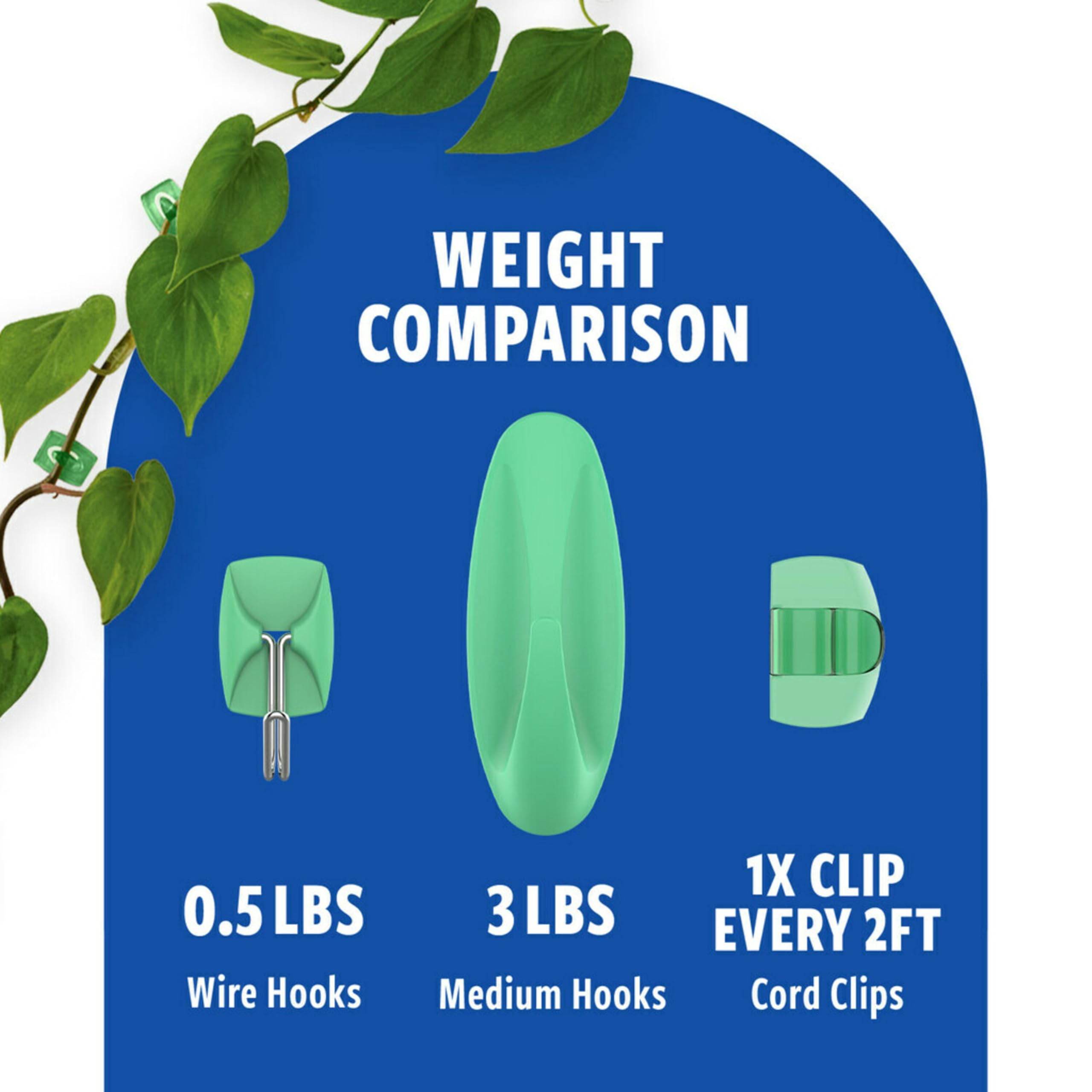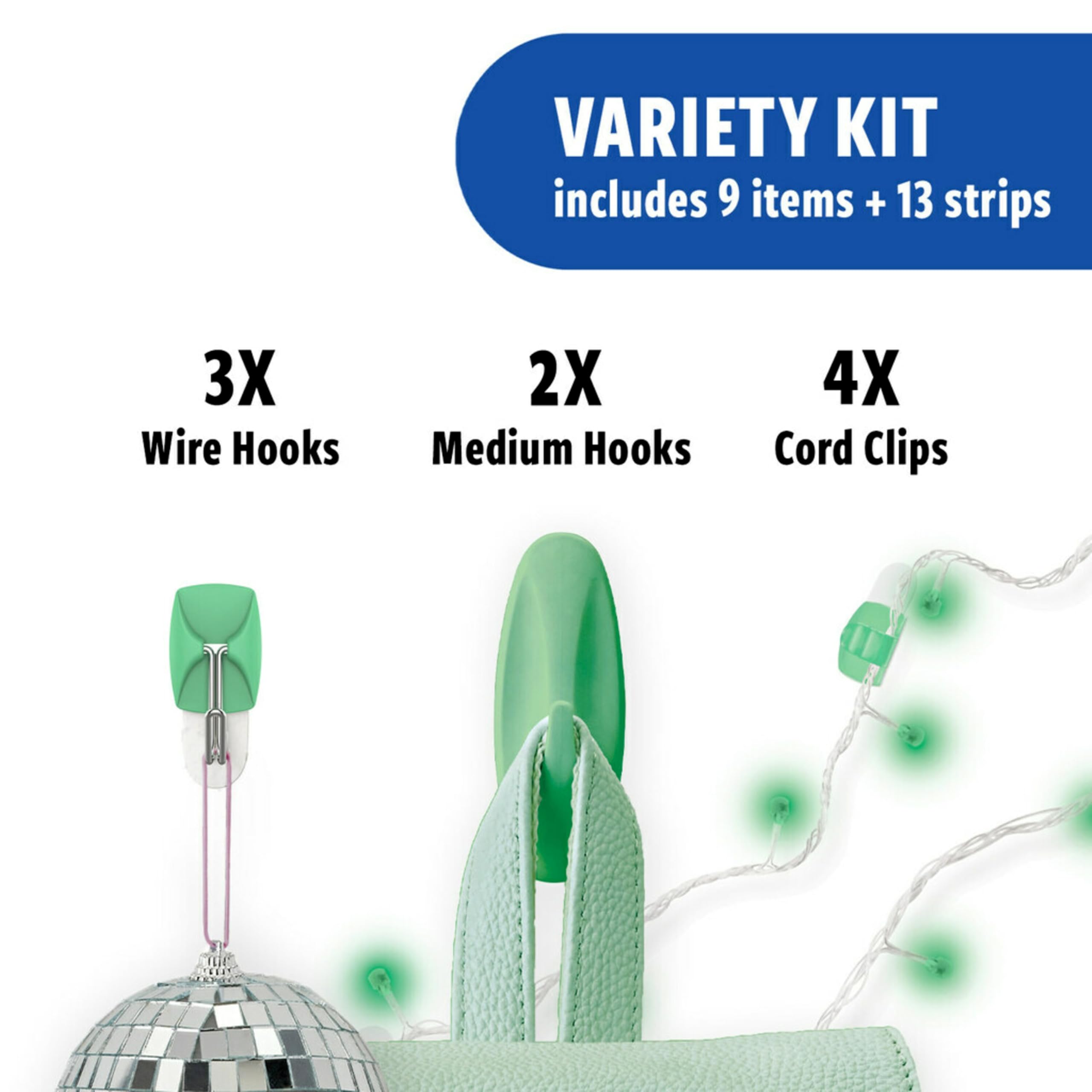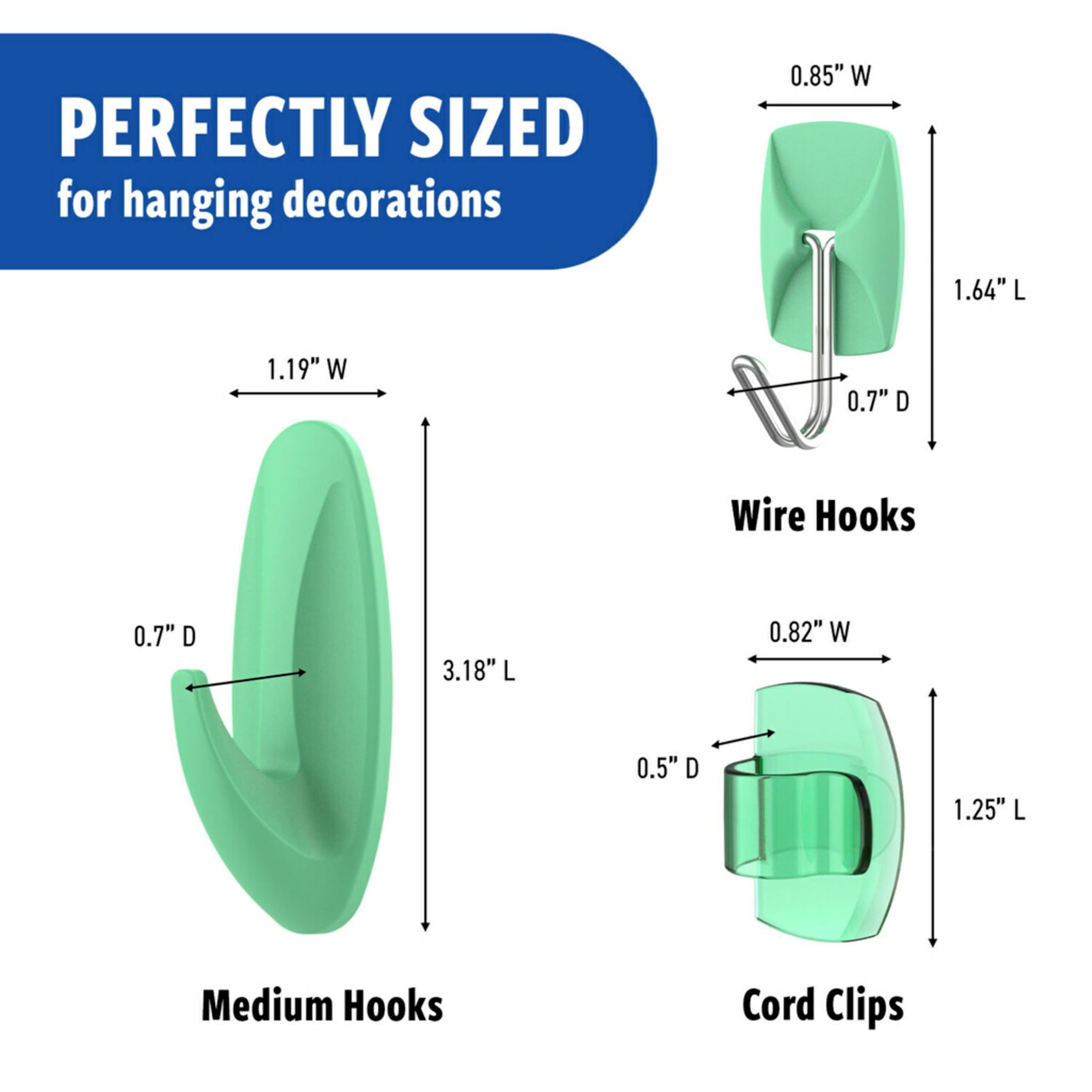 LIMITED EDITION PACK: Featuring our fresh Aloe color, this Limited Edition pack includes 2 medium designer hooks, 4 medium indoor strips, 3 small wire hooks, 4 small indoor strips, 4 clear round cord clips, and 5 small clear strips.