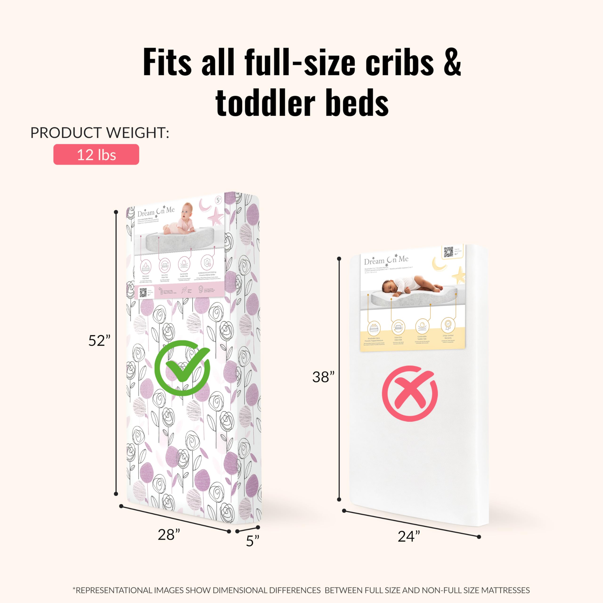 LIGHTWEIGHT & DURABLE: The mattress weighs only 6 lbs. and is made to make change of bedding a breeze. It’s square corner design provide a snug fit in standard cribs. Mattress Dimensions: of 52” L x 28” W x 5” H (inches)
