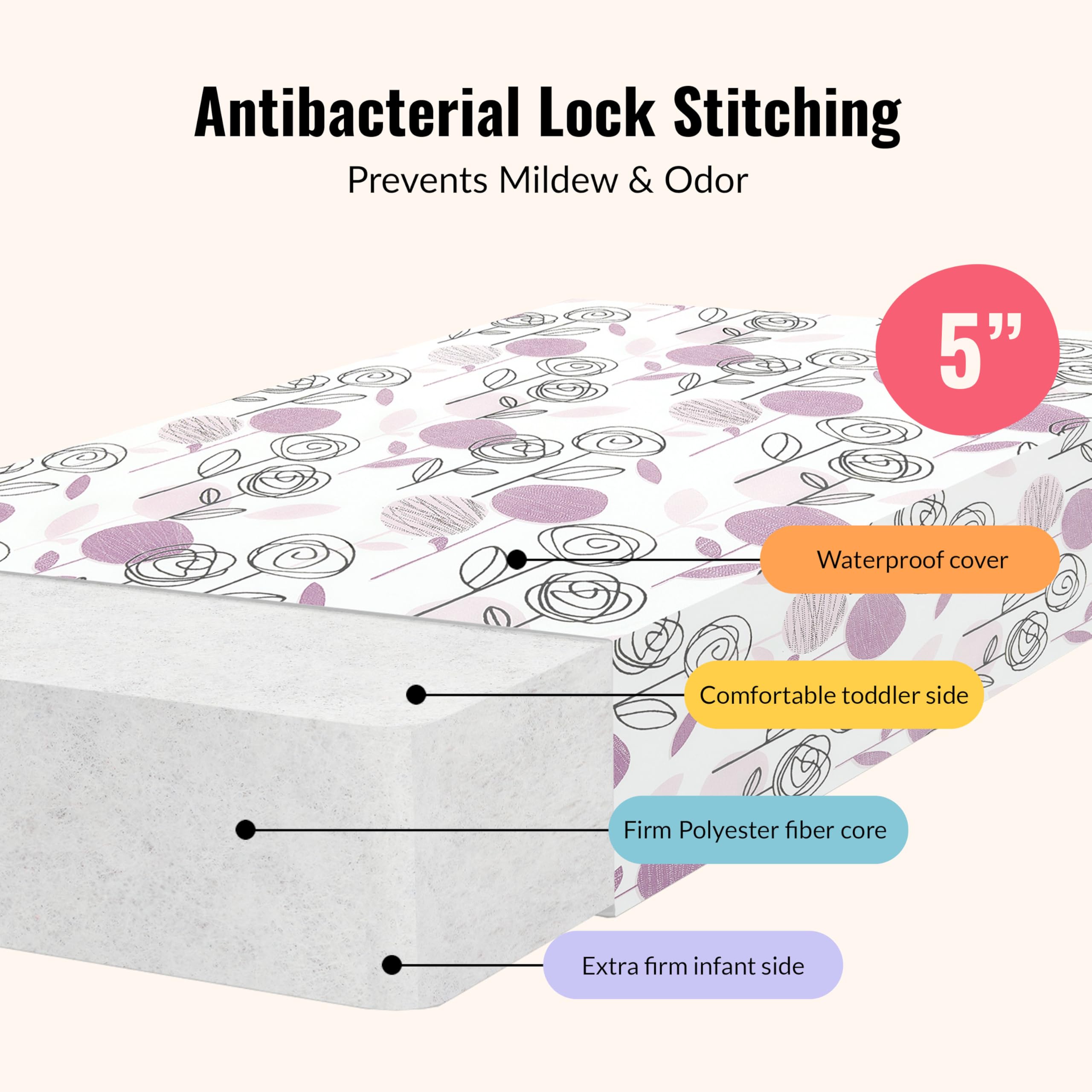 Contemporary & comfy for peaceful nights of slumber! Bring home the Dream On Me Floral Dreams Firm Fiber Standard Crib Mattress to complete your nursery necessities. Designed to adapt to your little one’s growing body with pediatrician-recommended firm fiber, it combines durability & safety. This 5-inch Crib & Toddler Mattress is packed with necessary elements to keep you and your baby sleeping soundly like a Greenguard Gold Certification, JPMA certification, Federal Flammability Standards certifications and a 5-year limited warranty! What’s more, this adorable mattress comes in 2 finishes – fresh, earthy Teal and minimal flower power Rose Pink! It’s lightweight at just 6 lbs. with a waterproof soft vinyl cover, making it easy to clean, and dimensions of 52” L x 28” W x 5” H (inches).