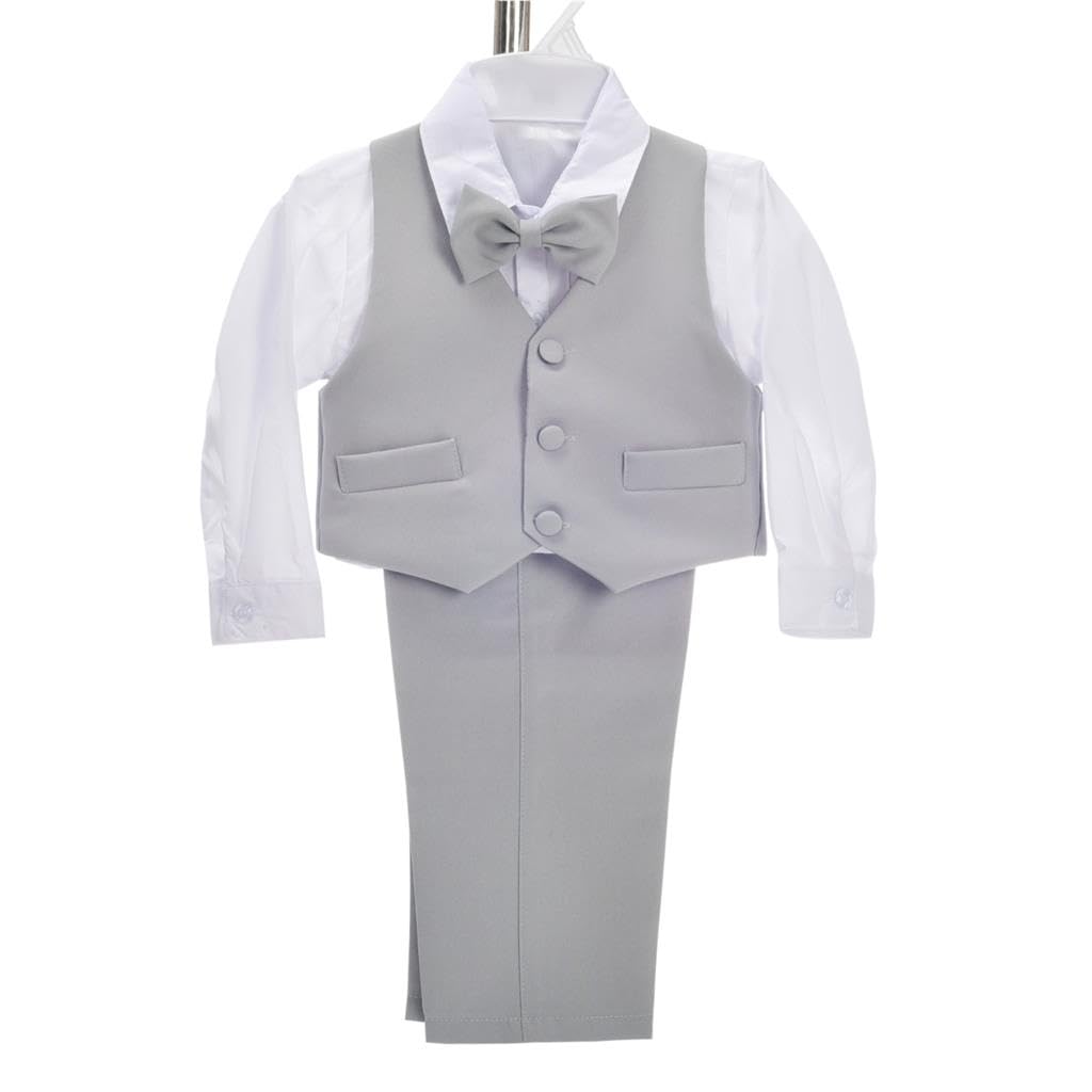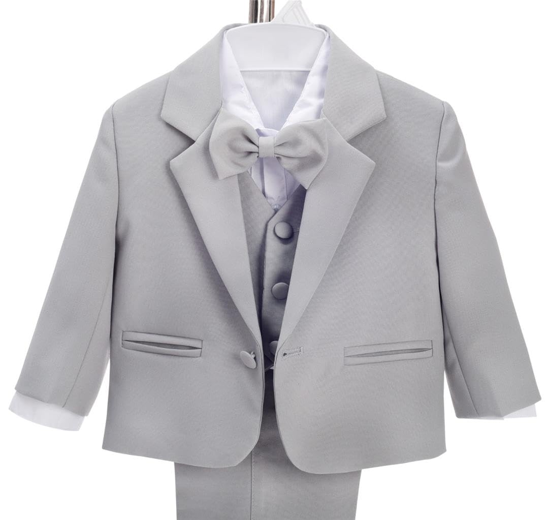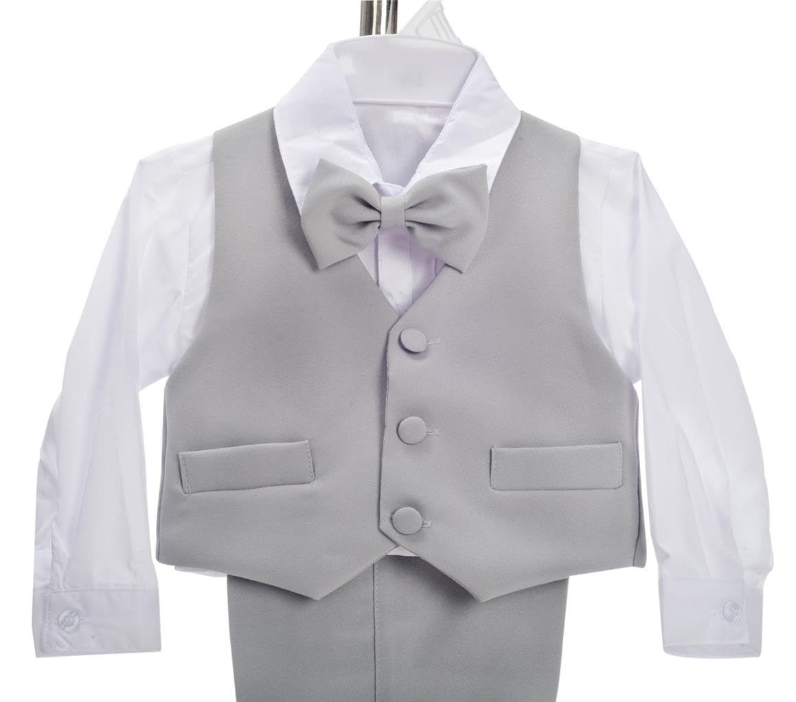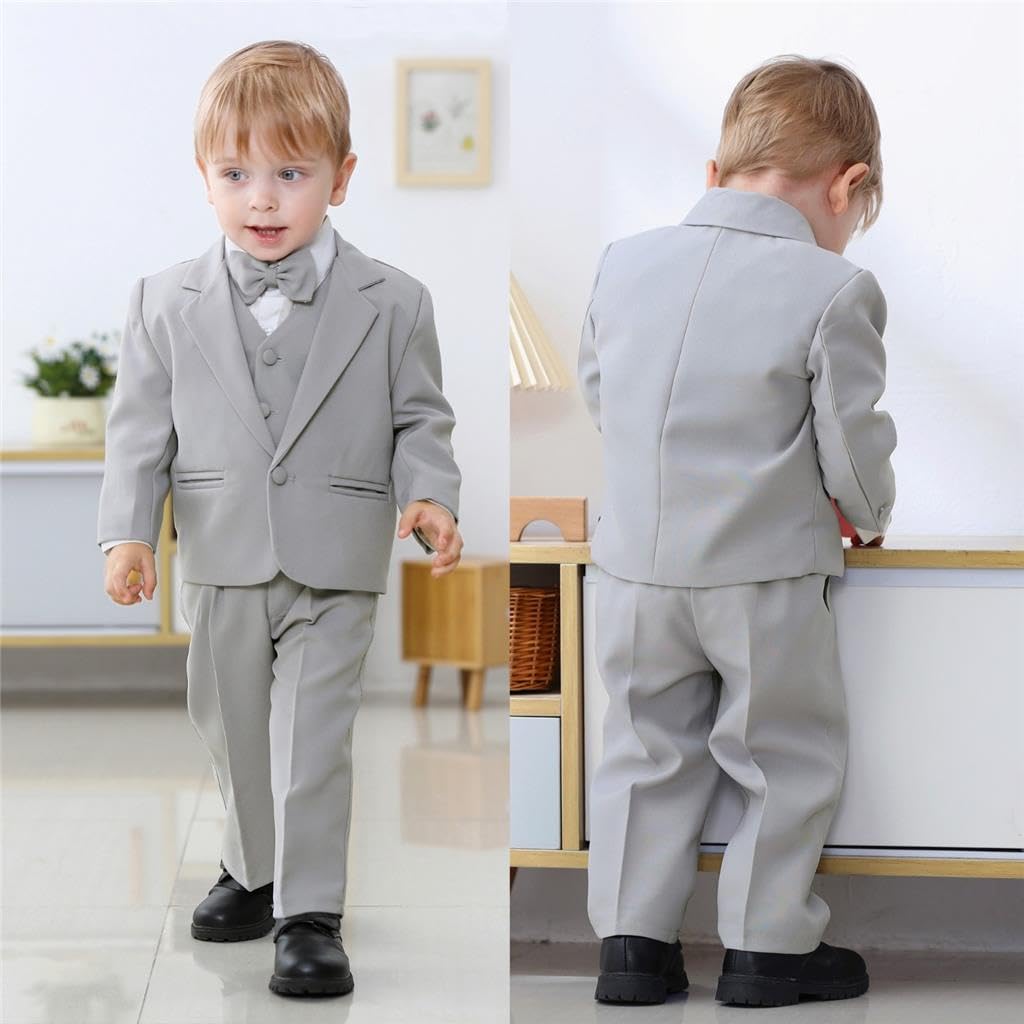 [5 Pieces Little Boys Tuxedo Suit Set] This smart 5-piece gentleman suit set formal outfit includes blazer jacket, white dress shirt, adjustable bow tie, vest and pants. Made of luxurious polyester and cotton fabric. Breathable and comfortable.[Colors] Black, White, Ivory, Light Gray, Silver Gray, Royal Blue, Khaki Beige, Dark Navy Blue, Charcoal Gray, Burgundy Red, Iron Gray. (NOTE: Product color may slightly vary due to the lighting of photo shooting.)