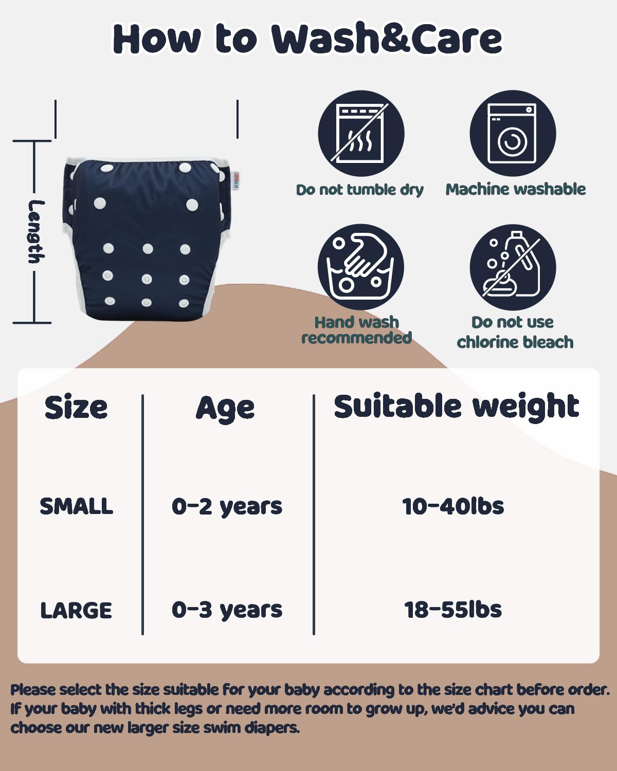 SINCERE SERVICE-If you have any problems with the product, please feel free to contact us, we’ll solve your issue ASAP. Please select the size suitable for your baby according to the size chart before order. If your baby with thick legs or need more room to grow up, we’d advice you can choose our new larger size swim diapers.