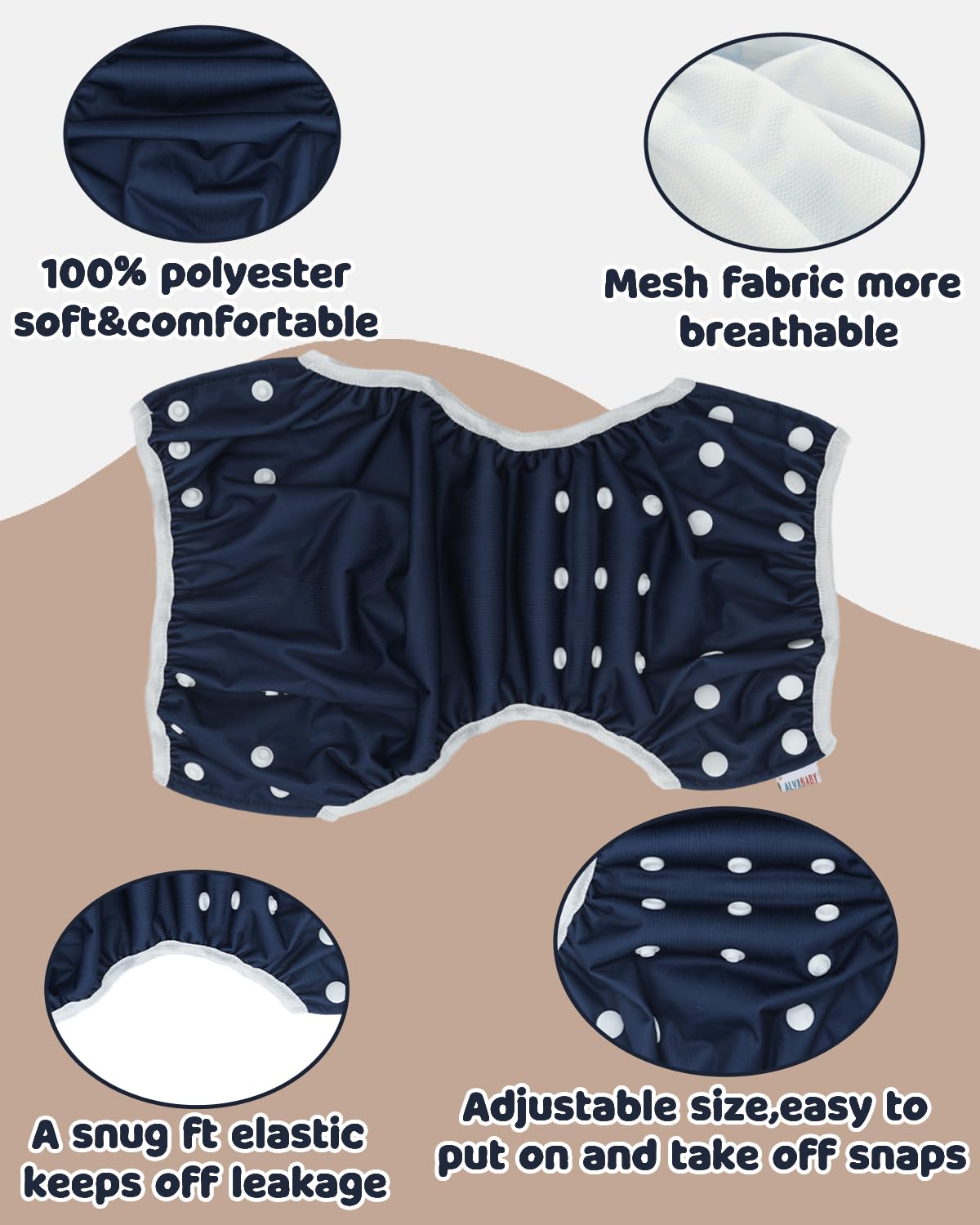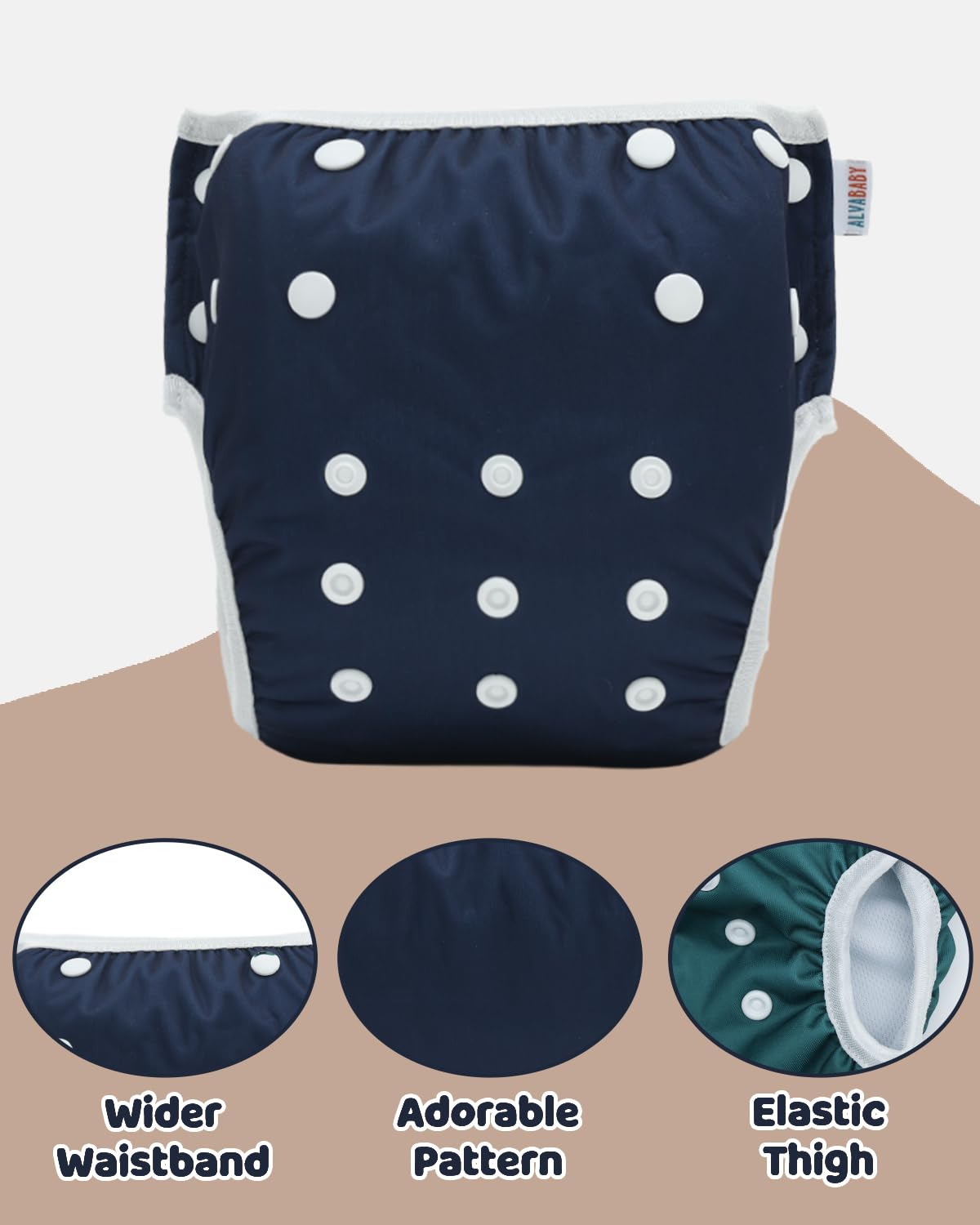 HIGH QUALITY, ADJUSTABLE, REUSABLE & WATERPROOF -ALVABABY swim diapers are made from waterproof 100% polyester PUL outer layer. Elastics waist and legs: Interior Polyester Elastics at the waist and leg openings with soft lycra bindings provides a secure, stretchy fit and easy on and off.