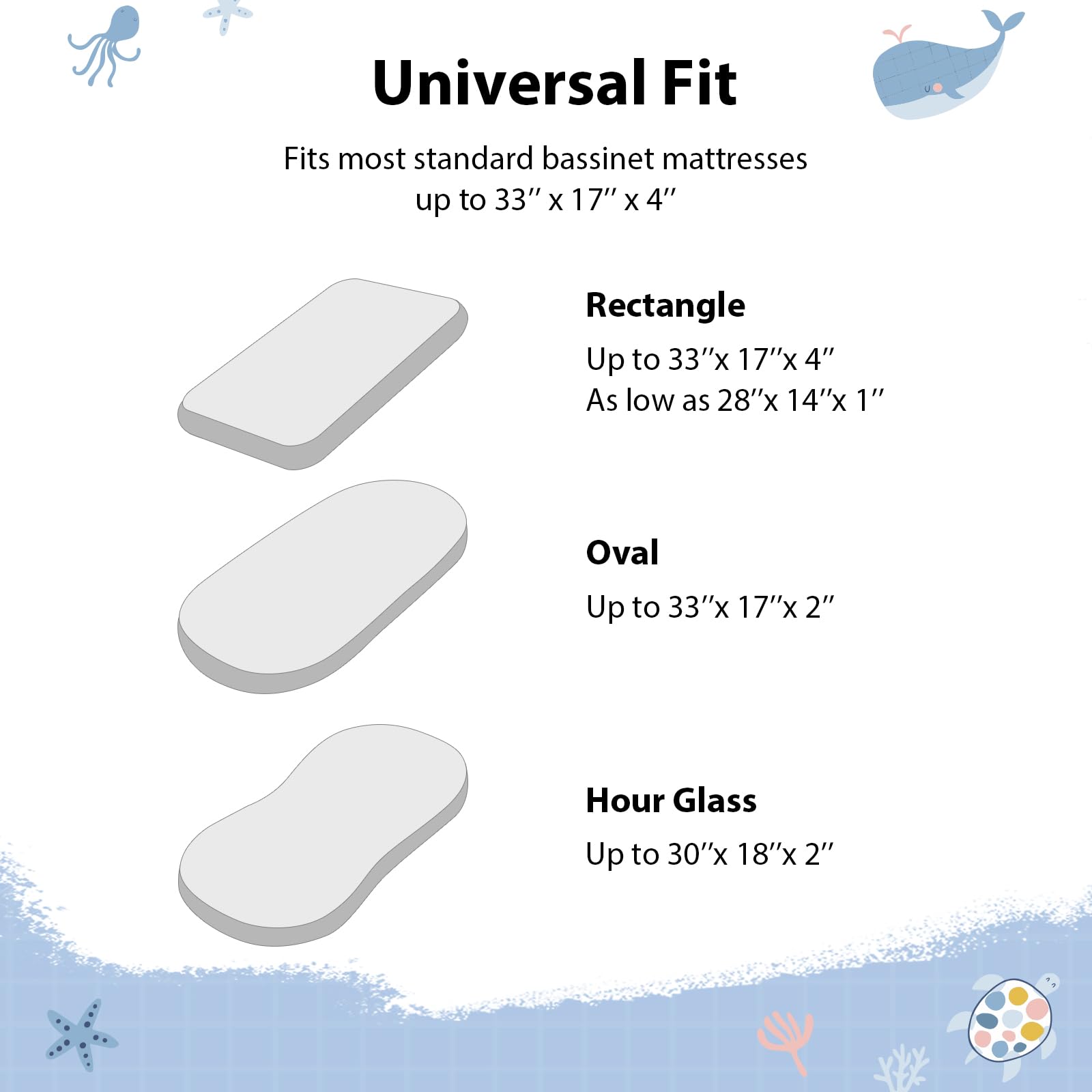 Snug Fit: Measuring 32” x 16”, the 3 pack bassinet fitted sheets fit most oval, round, rectangle, hourglass shaped bassinet mattresses. With full elastic edges of the bassinet sheets, a 5-inch deep pocket, and stretchy fabric, they ensure a snug, wrinkle-free fit that stays securely in place, even during your baby’s most active nights.