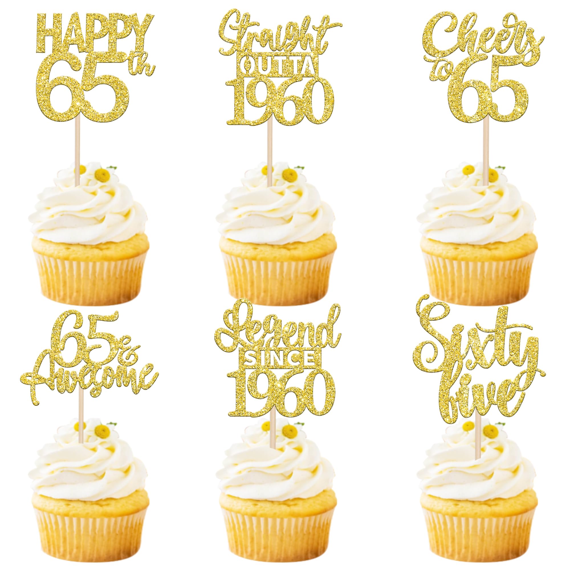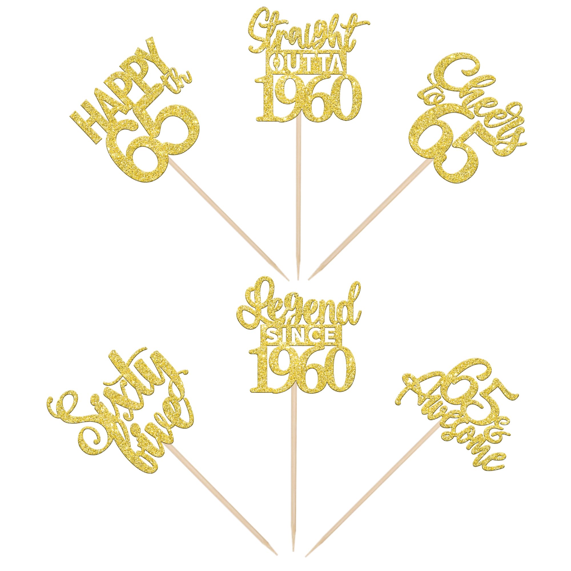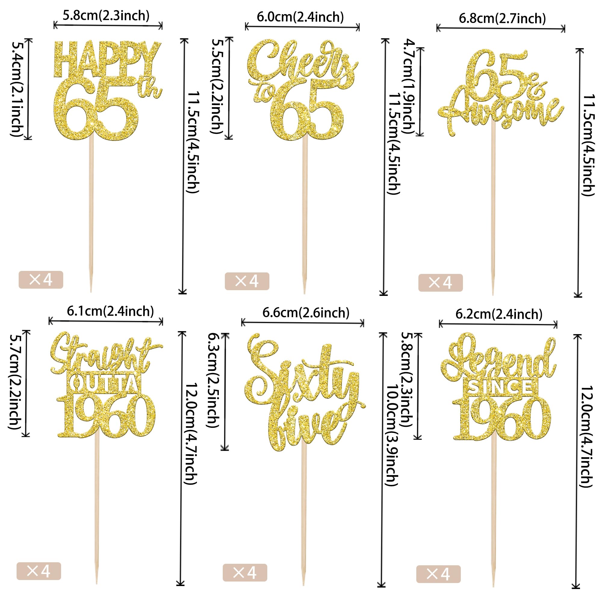 24PCS Happy 65th Birthday Cupcake Toppers Sixty Five Straight Outta 1960 Cupcake Picks Cheers to 65 Birthday Decorations Lengend Since 1960 Cupcake Decorations for 65th Birthday Anniversary Party Cake Decorations Supplies Perfect for legend since 1960 theme party, 65th anniversary theme party,cheers to 65 years theme party, 65 awesome theme party cupcake decorations supplies. Pack of 24 pcs,4 pcs of each design. The size is 2.3*4.5/ 2.4*4.5/ 2.7*4.5/ 2.4*4.7/ 2.6*3.9/ 2.4*4.7 inch ( with stick ) Made of high quality paper card stock,thick and sturdy. These straight outta 1960 cupcake toppers are one side glitter, another side is white, and they are intended for decoration only, please do not put them in oven or microwave. If the item you received has any defects, please contact us immediately.we will deal with it within 24 hours.