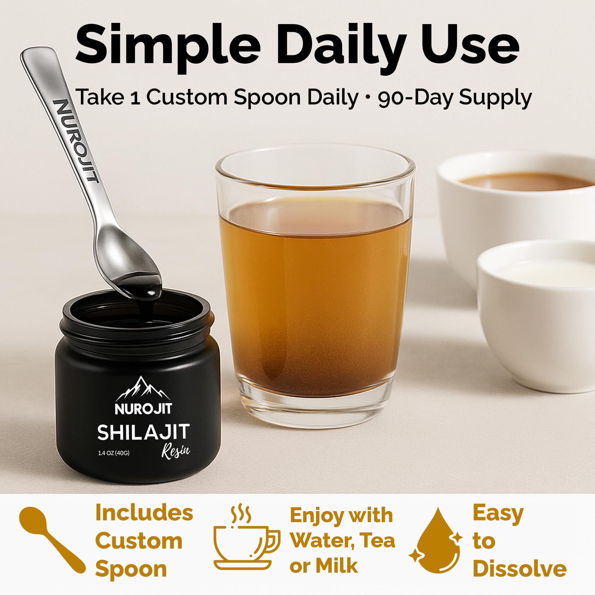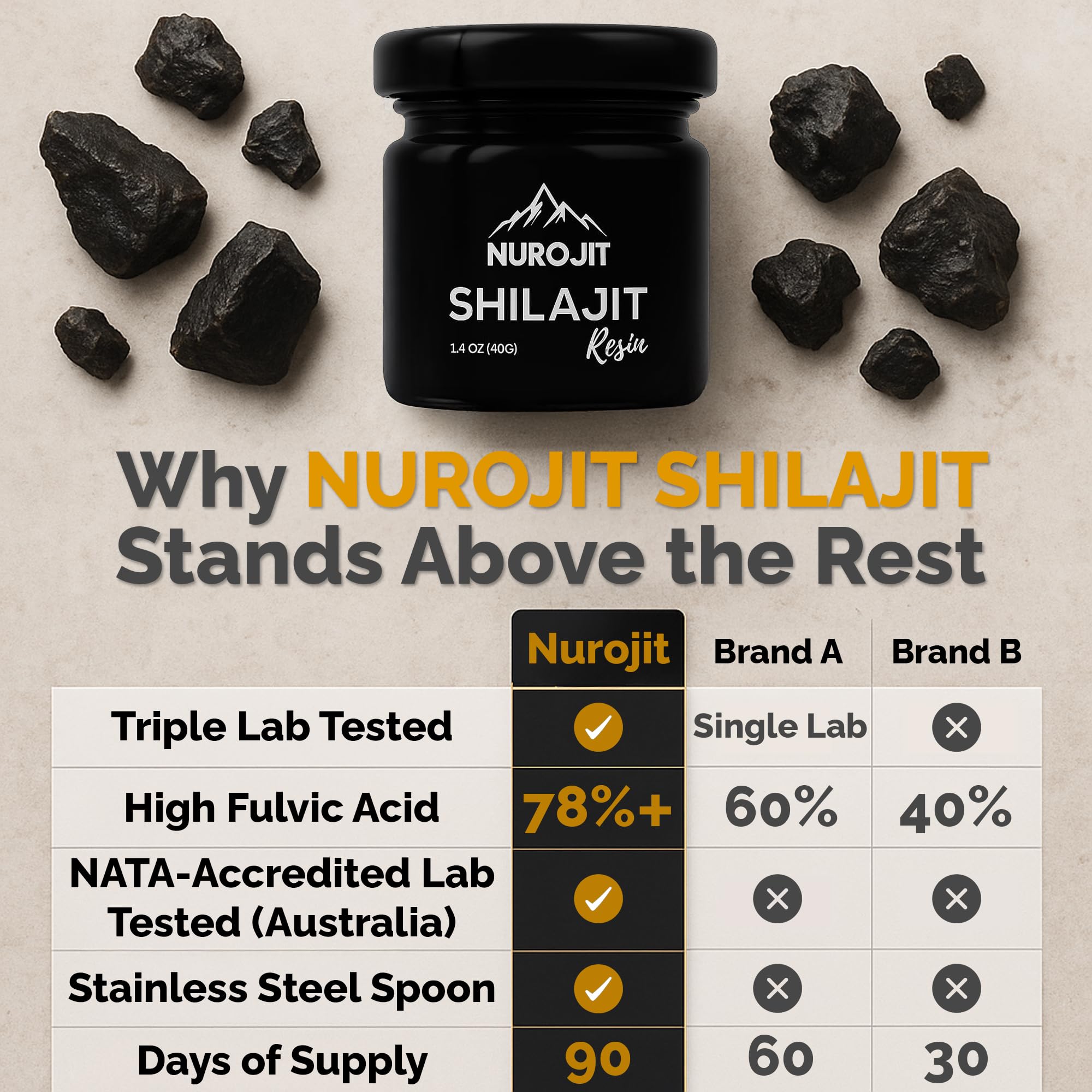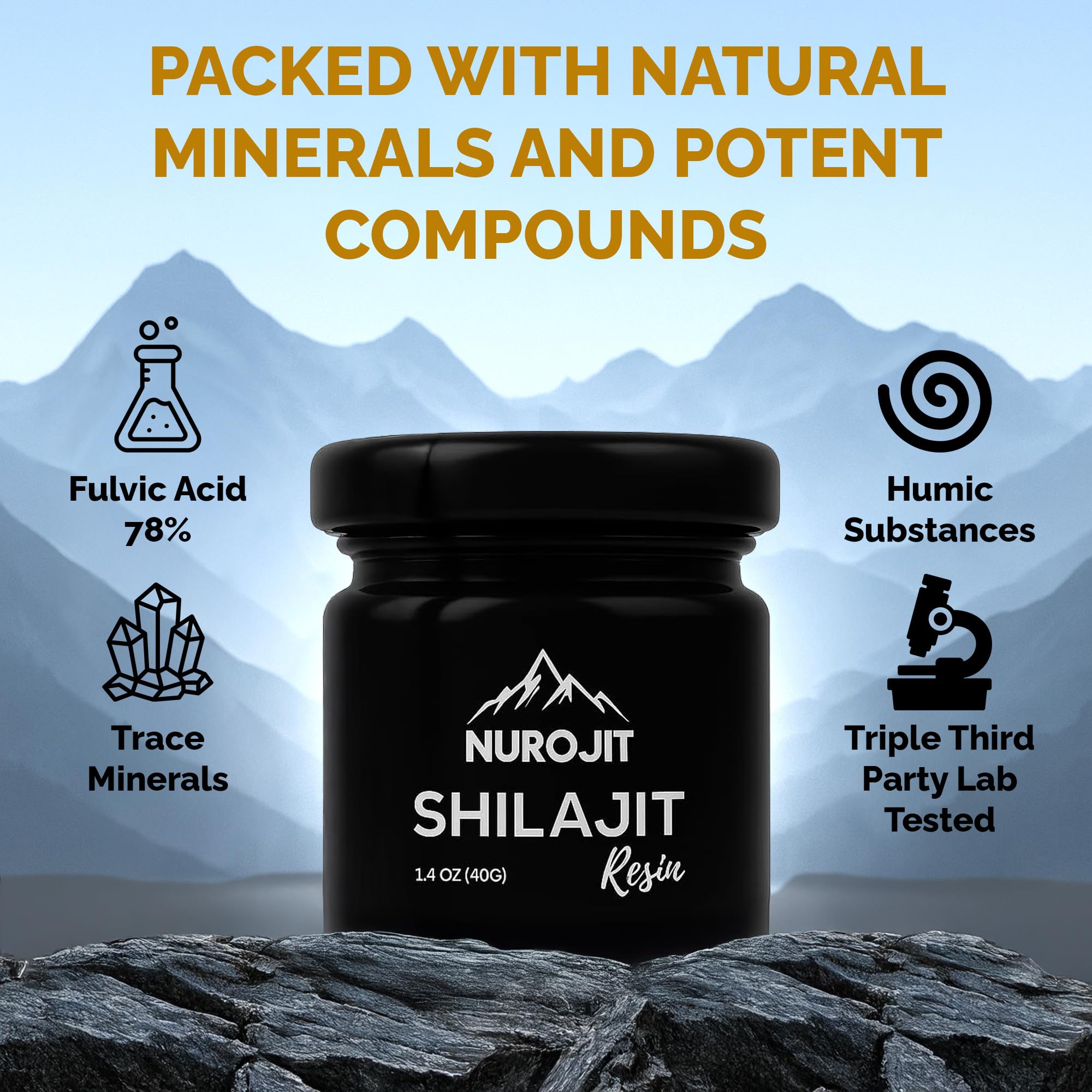 Nurojit Pure Shilajit Resin is prepared as a Himalayan mineral complex for those who value clean sourcing and straightforward preparation. Collected from high-altitude rock formations, the resin is carefully purified to maintain its natural character. Its tar-like texture dissolves smoothly in warm water, tea, milk, or coffee and can also be added to smoothies. Each 40 g jar is sealed to help preserve freshness and the natural qualities of the resin. This product stands out for its focus on safety and consistency. Every batch is tested in accredited laboratories for heavy metals and microbial counts before packaging in a GMP-certified facility. The resin is free from unnecessary additives such as fillers, preservatives, or flavorings, keeping it close to its natural form. Shilajit naturally carries fulvic and humic substances together with trace minerals that develop over centuries from ancient plant matter. Offered in resin form rather than capsules or powders, it provides flexibility in daily use. A rice-grain sized portion, about 250–500 mg, is generally dissolved in warm liquid once daily. Natural variations in texture, color, and aroma are normal indicators of origin. If the resin firms, warming the jar in your hands will soften it again. This shilajit resin is vegan friendly, cruelty free, halal friendly, and gluten free. Its sealed packaging helps protect against moisture and air exposure while preserving freshness. Store in a cool, dry place with the lid closed securely. This is not a medical treatment; consult a healthcare professional if you are pregnant, nursing, managing a condition, or taking medication. Keep out of the reach of children. Nurojit emphasizes clean preparation and reliable standards. Whether stirred into tea, blended into a latte, or added to a morning routine, this resin provides a simple way to include a traditional Himalayan mineral complex without added fillers or unnecessary claims.