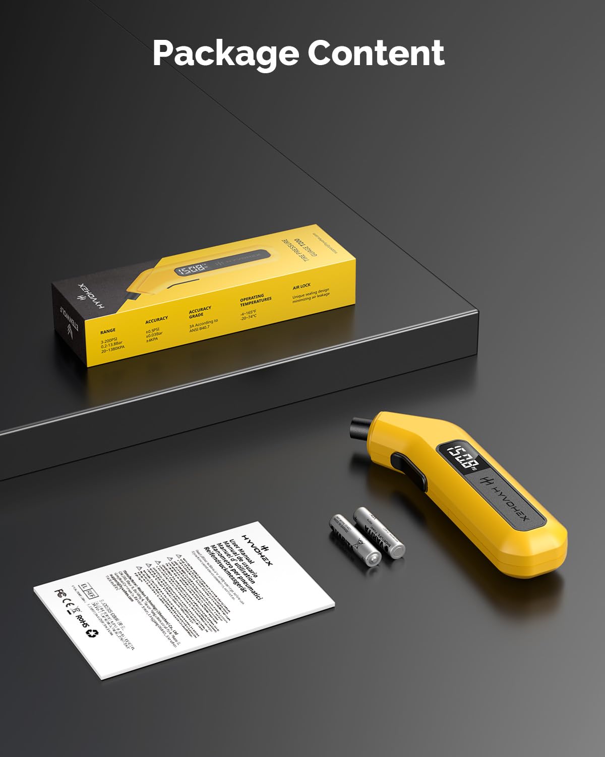 【Accurate Digital Tire Gauge】Safeguard your every trip. HYVOHEX tire pressure gauge is certified by ANSI B40.7 Grade 2A standard and equipped with a high-sensitivity sensor to provide you with instant, error-free results (±0.1 PSI). The intelligent anti-interference chip ensures stable operation in extreme temperatures (-4°F-130°F). Whether it is daily commuting or long-distance driving, you can always know the tire condition