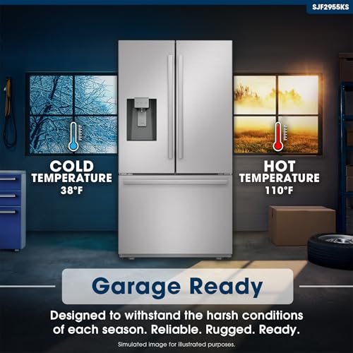 DESIGNED FOR YOUR DREAM KITCHEN The SJF2955KS, French-Three-Door Refrigerator, with a spacious 28.9 cu. ft. capacity, pairs beautifully with other stainless steel appliances, while resisting fingerprints and smudges. Inside the refrigerator, the five bright white LED lights give you a clear view, plus there is an additional LED light in the Freezer Drawer. This refrigerator incorporates an Advanced Cooling Plus System, which helps maintain optimal freshness for your groceries. An ice and water dispenser on the door provides cubed ice, crushed ice, and water without opening the door. Dual ice makers provide up to 6.9 lbs. of ice per day for even your largest gatherings. For accelerated cooling, Chill-Boost and Freeze-Boost options are available to quickly adjust the refrigerator and freezer internal temperatures as needed. This ADA compliant refrigerator’s touch control panel is conveniently located on the door for easy access. A slide-In shelf and adjustable gallon door bins allow you to organize your refrigerator and create more space for large items like pitchers and bottles. The freezer compartment features an EZ Slide Drawer for easy access to frozen items and automatic defrost for hassle-free maintenance. This refrigerator runs quietly at less than 43 dB and is Energy Star certified for a peaceful environment while conserving energy. With extra-large storage capacity and thoughtful engineering, the elegant SJF2955KS refrigerator really is Simply Better Living.