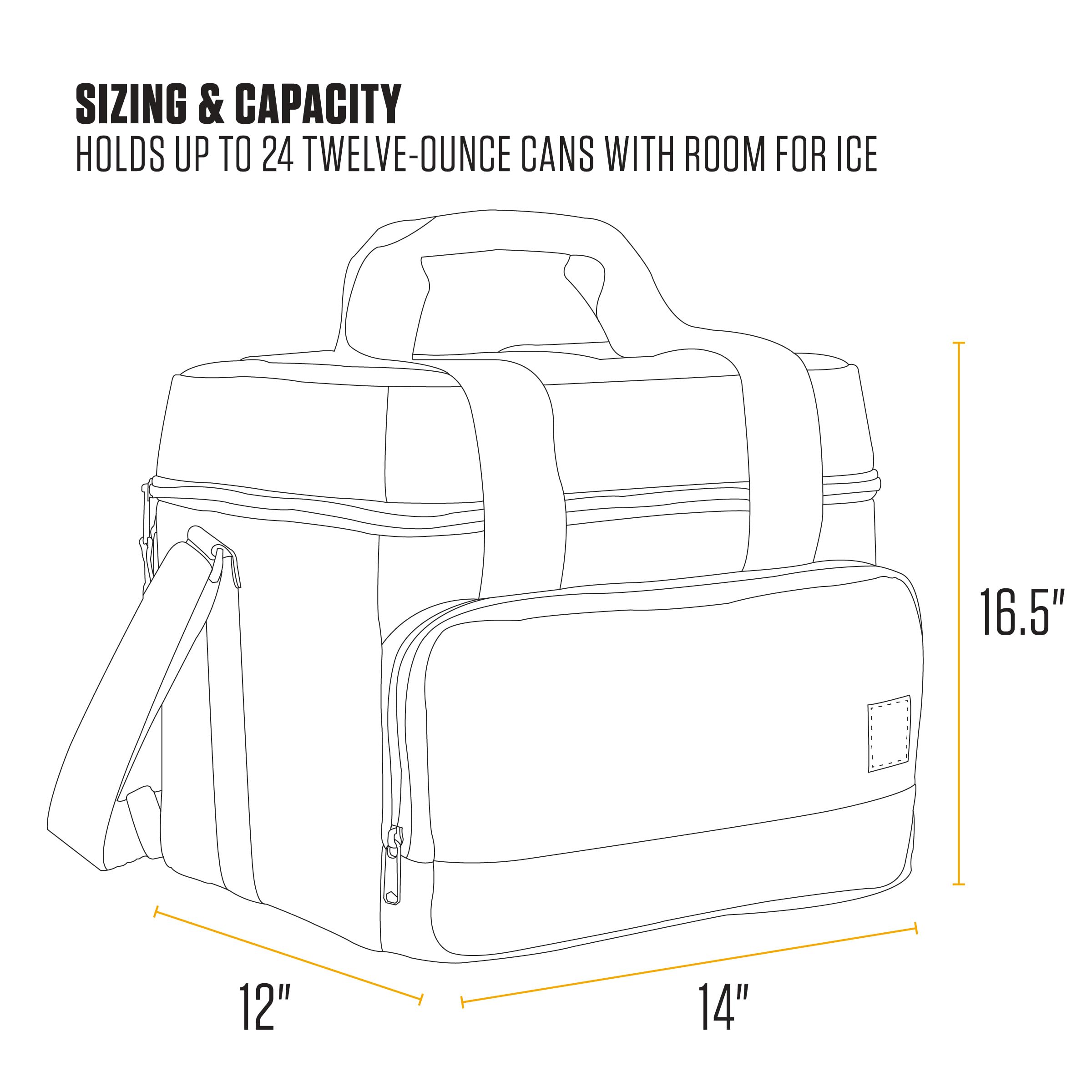 DURABLE INSULATED LINING| Cooler is lined with durable lining that effectively minimizes heat loss and maintains optimal temperatures. Built to last, our liners resist tearing and wear, ensuring long-term performance and cleaning with ease. Dimensions 14” X 12.5” X 12”