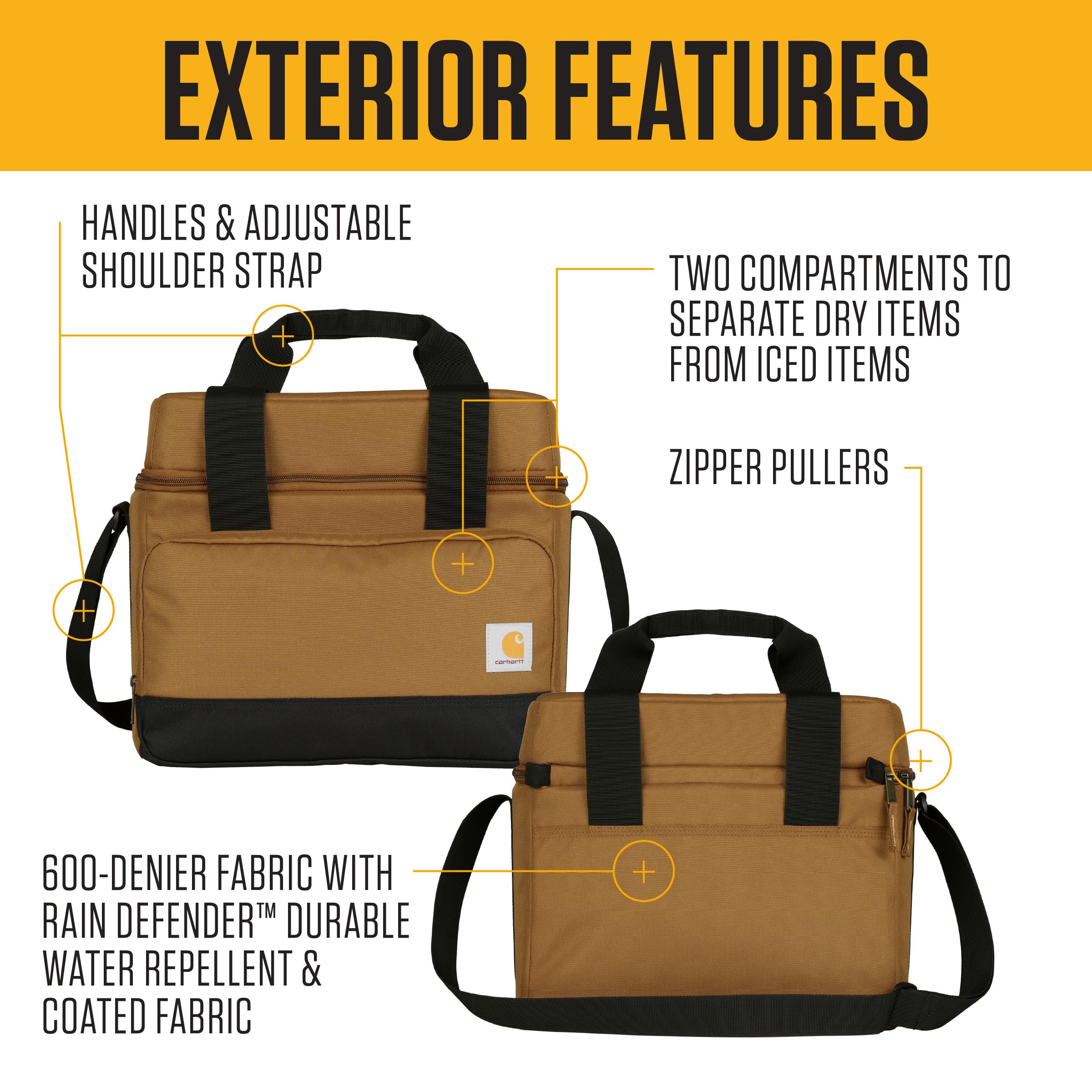 The Carhartt Insulated Two Compartment Lunch Cooler is perfect for any occasion, built to withstand the harshest elements while maintaining your food’s freshness. This versatile lunch box for women and men features a fully-insulated base compartment that offers ample space for your favorite meals and snacks, keeping them cold for hours. Whether you're headed to work, school, a job site, a family road trip, or a picnic, this insulated lunch bag for women ensures your food stays fresh all day. Its spacious interior easily accommodates sandwiches, fruits, beverages, and more without compromising on quality. Crafted from durable 600-denier polyester with Rain Defender DWR coating, this large lunch box for women is designed for daily wear and tear. The rugged construction protects your lunch from light rain, while the synthetic lining enhances durability. Reinforced seams and sturdy zipper closures add extra reliability, making this lunch box women love a dependable companion for all your adventures.