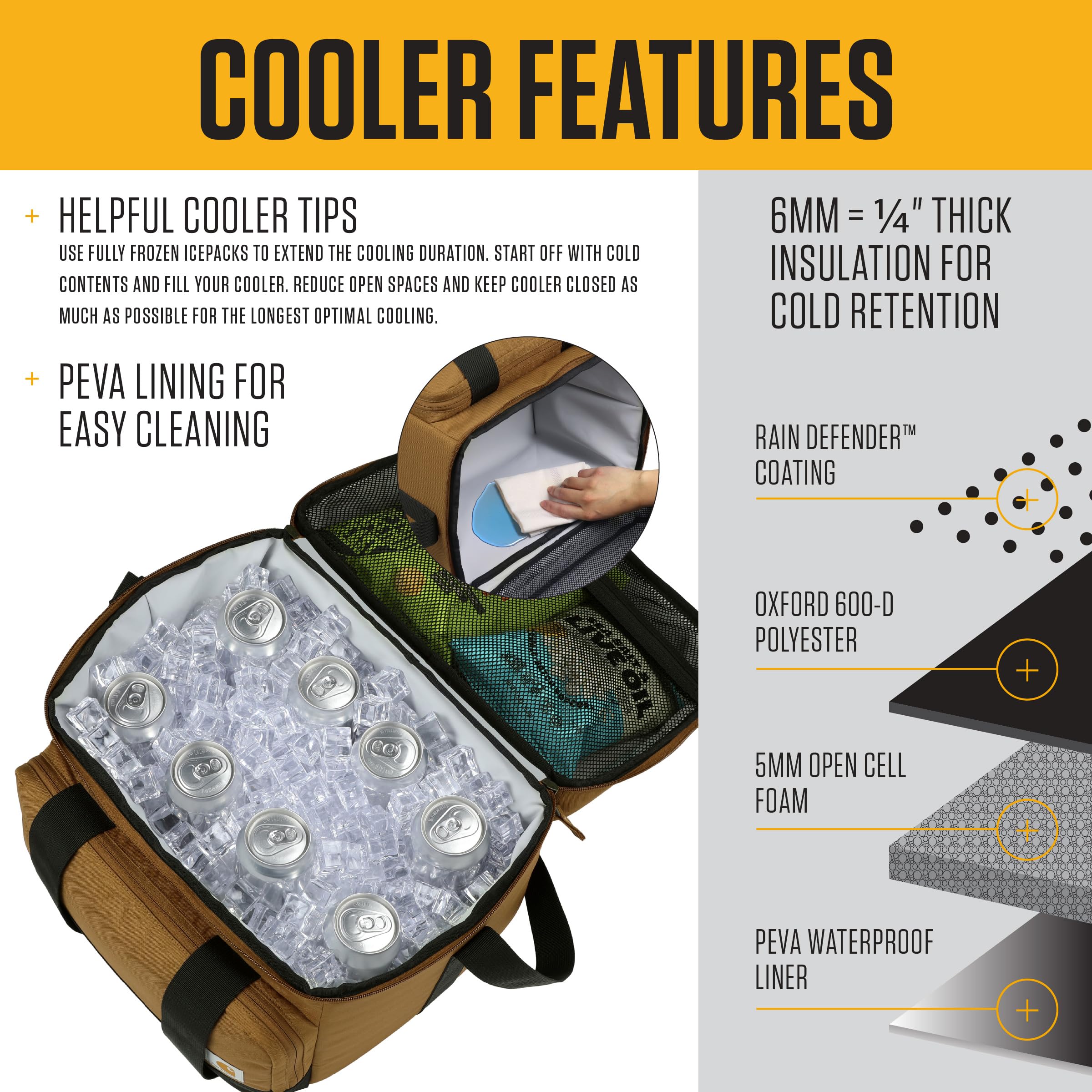 PORTABLE AND DURABLE | Designed for people on the move, this cooler boasts a durable 600-denier polyester with RAIN DEFENDER exterior with an on the go handle for easy carrying, making it perfect for daily use or weekend adventures