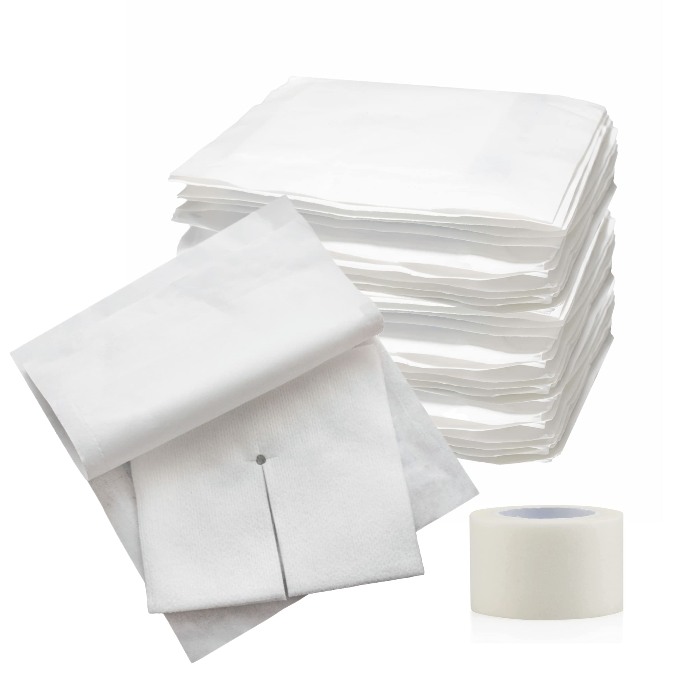 TAPE INCLUDED - Each pack of the 4-inch by 4 inch spilt drain dressing pad comes with a roll of medical tape. Rolls of tape are 1’’ wide and 10 Yards long and tears easily without shredding.