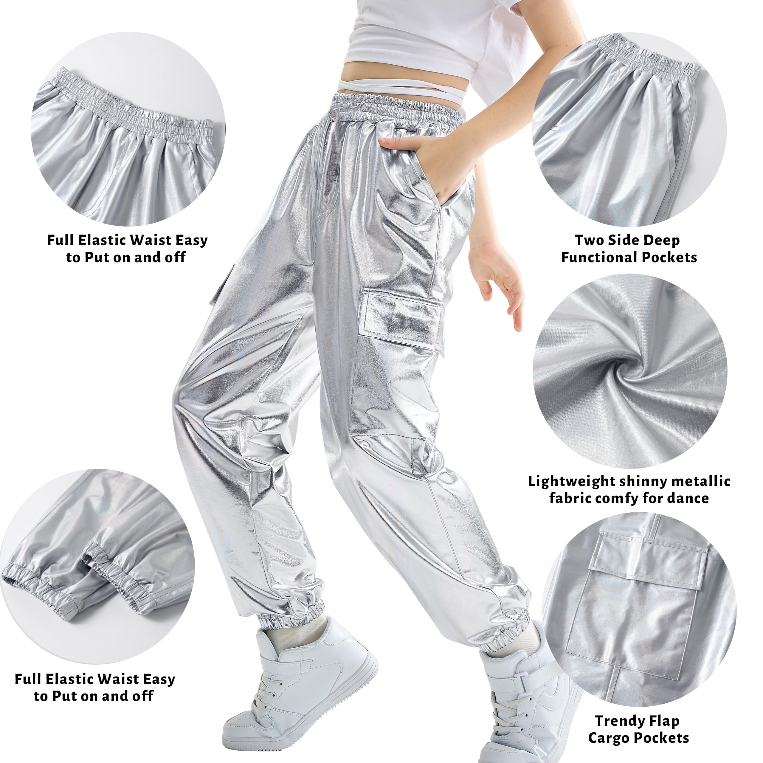 【Wash Tips】: Machine Wash Cold with Like Colors, Machine wash 30 °C, Do not bleach, Line drying, Do not iron, Do not dry cleaning, 2 colors available-silver pants, gold pants. This girls cargo jogger pants will be a must in your wardrobe, make you more shiny look in crowd.