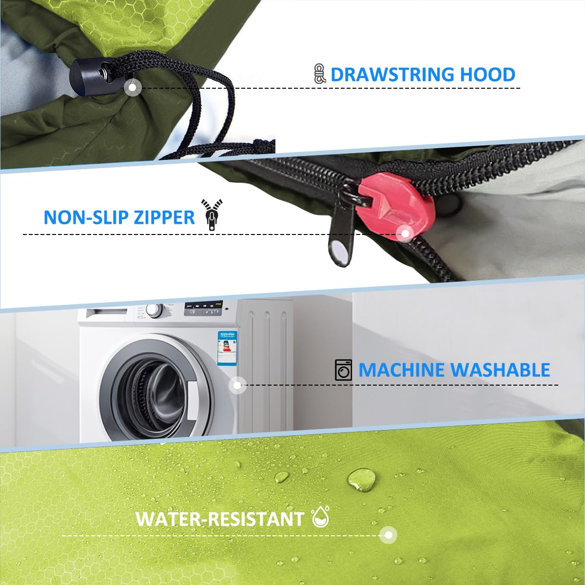 MATERIAL:Outer Cover Material-premium 210T Anti-tearing Polyester Fabric which is waterproof and Breathable; Lining Material:190T polyester pongee
