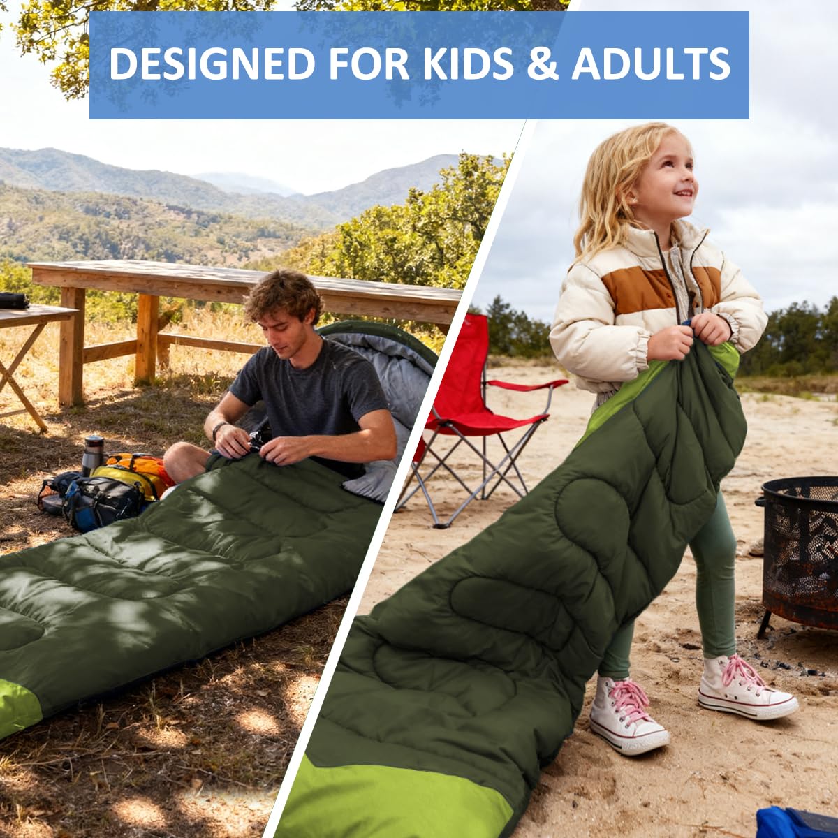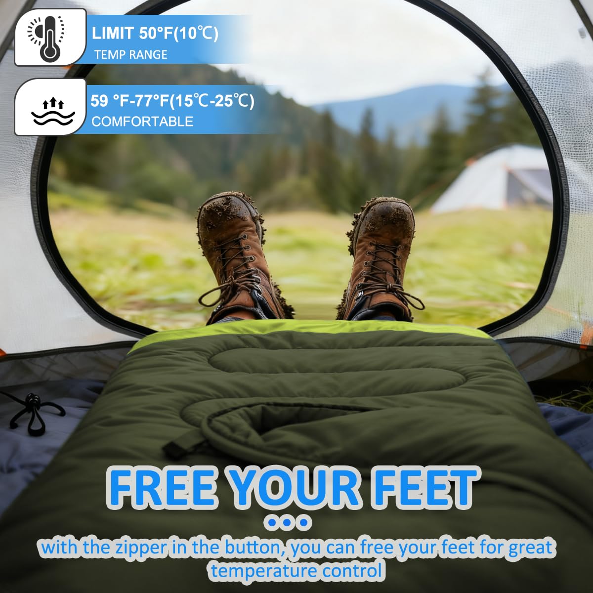 DESIGN: Separated zipper at the bottom can also make your feet often come out through the wind. Half-circle hood with adjustable drawstring keeps your head warmer even in extreme conditions.Our sleeping bags are designed to provide much needed rest after a full day of outdoor activities.