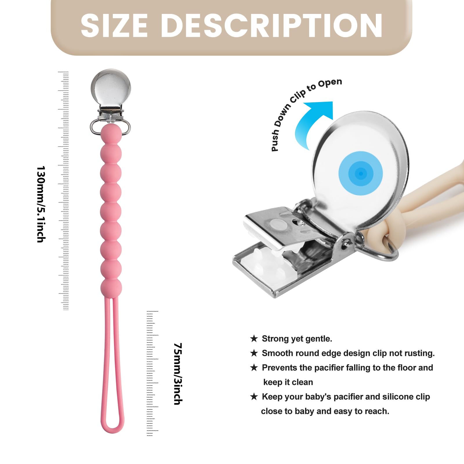 【FOOD GRADE STANDARD】Length:23cm Weight: 0.8oz. BPA Free Pacifier Clip. No pvc, cadmium, lead, phthalates