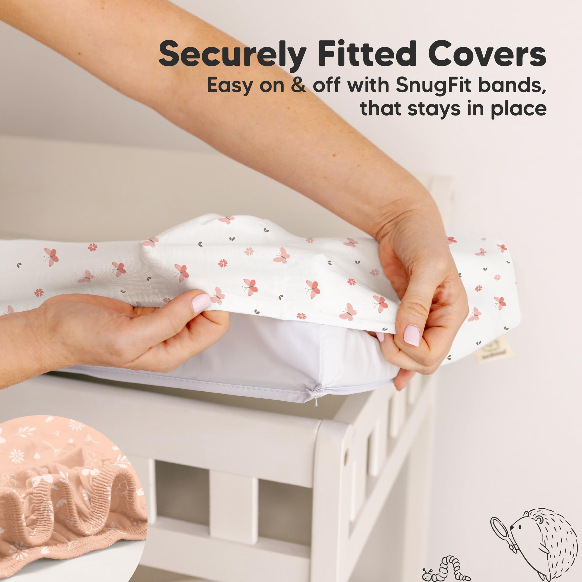 Fits Like a Hug - The SnugFit bands keep covers snug as a hug. Easy on and off, these baby changing pad covers stay put like they’re determined to stay in place, staying smooth and secure, ready for every wiggle your baby throws their way.