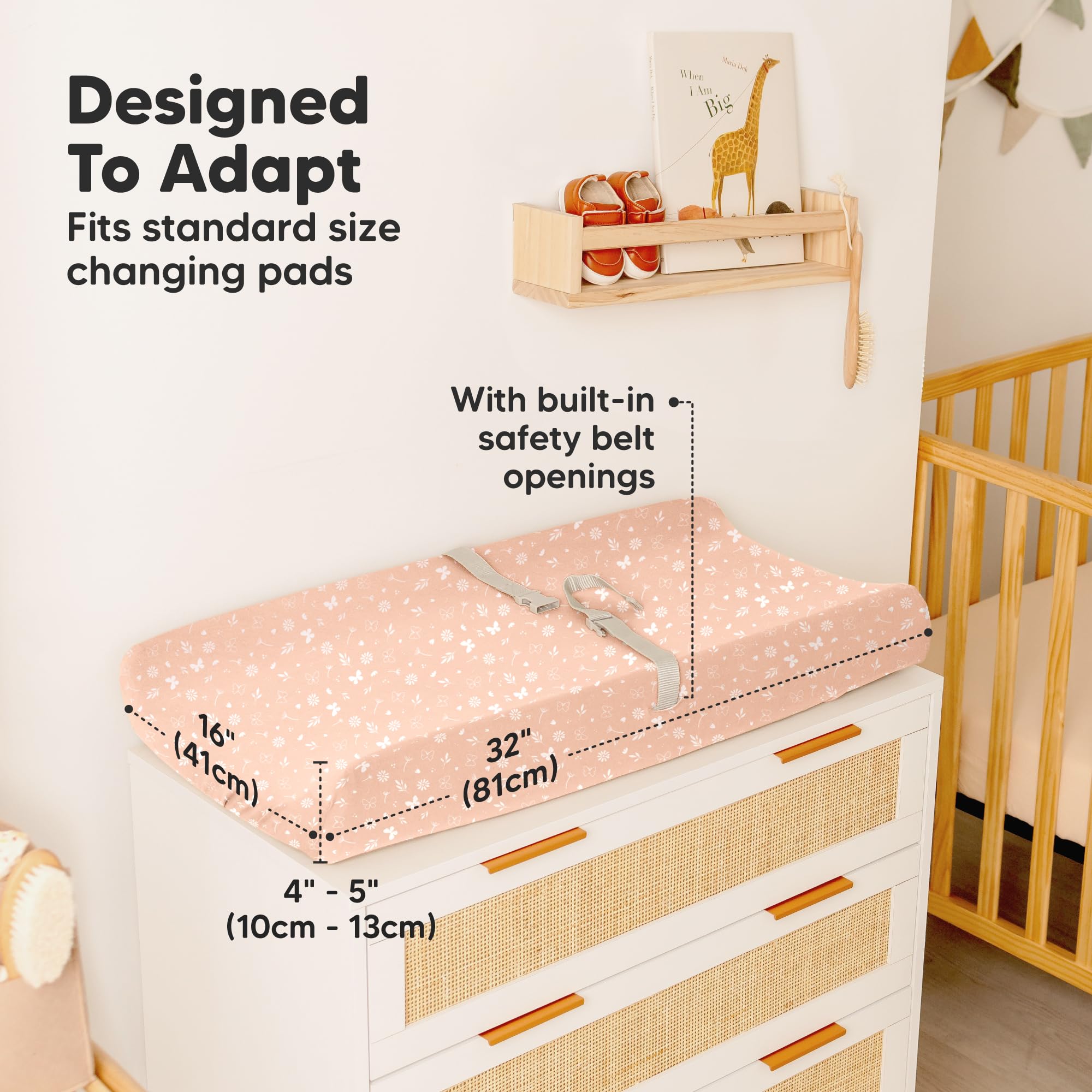 Instant Adapt - Our Changing Table Cover Sheets are designed to fit the curves of any standard 32" x 16" x 5" contoured changing pad. With built-in buckle holes for safety straps, these diaper pad covers ensure a snug and secure fit.
