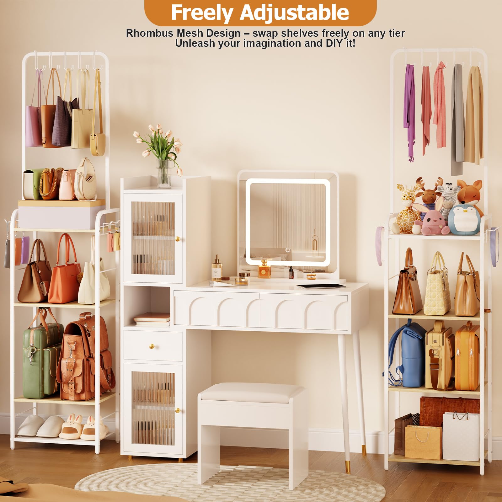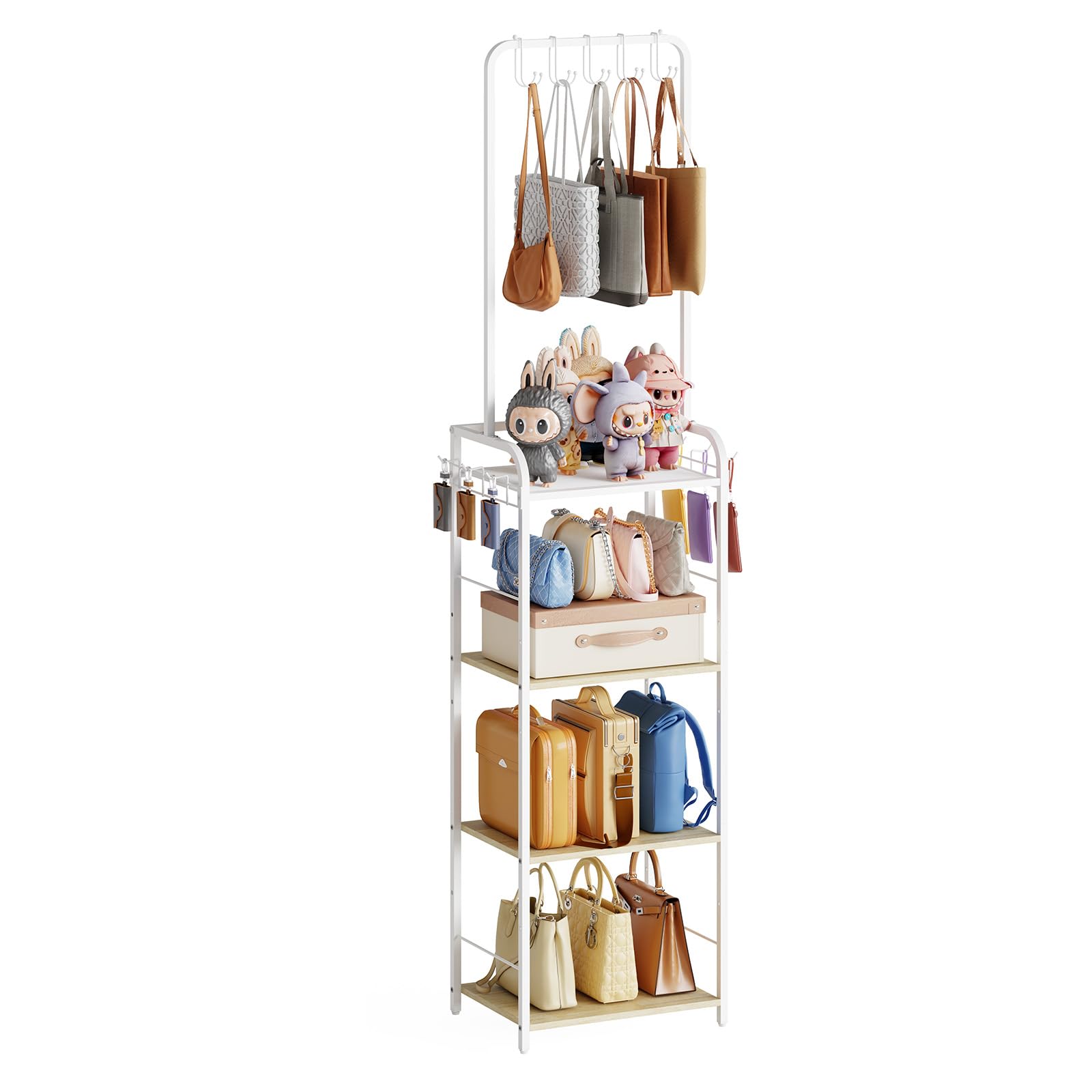 【Easy Setup & Versatile Display】 Simple assembly with modern white finish; freely customizable & interchangeable shelves for purses, vanity items or collectibles – perfect tall handbag rack for bedroom, entryway or closet organization