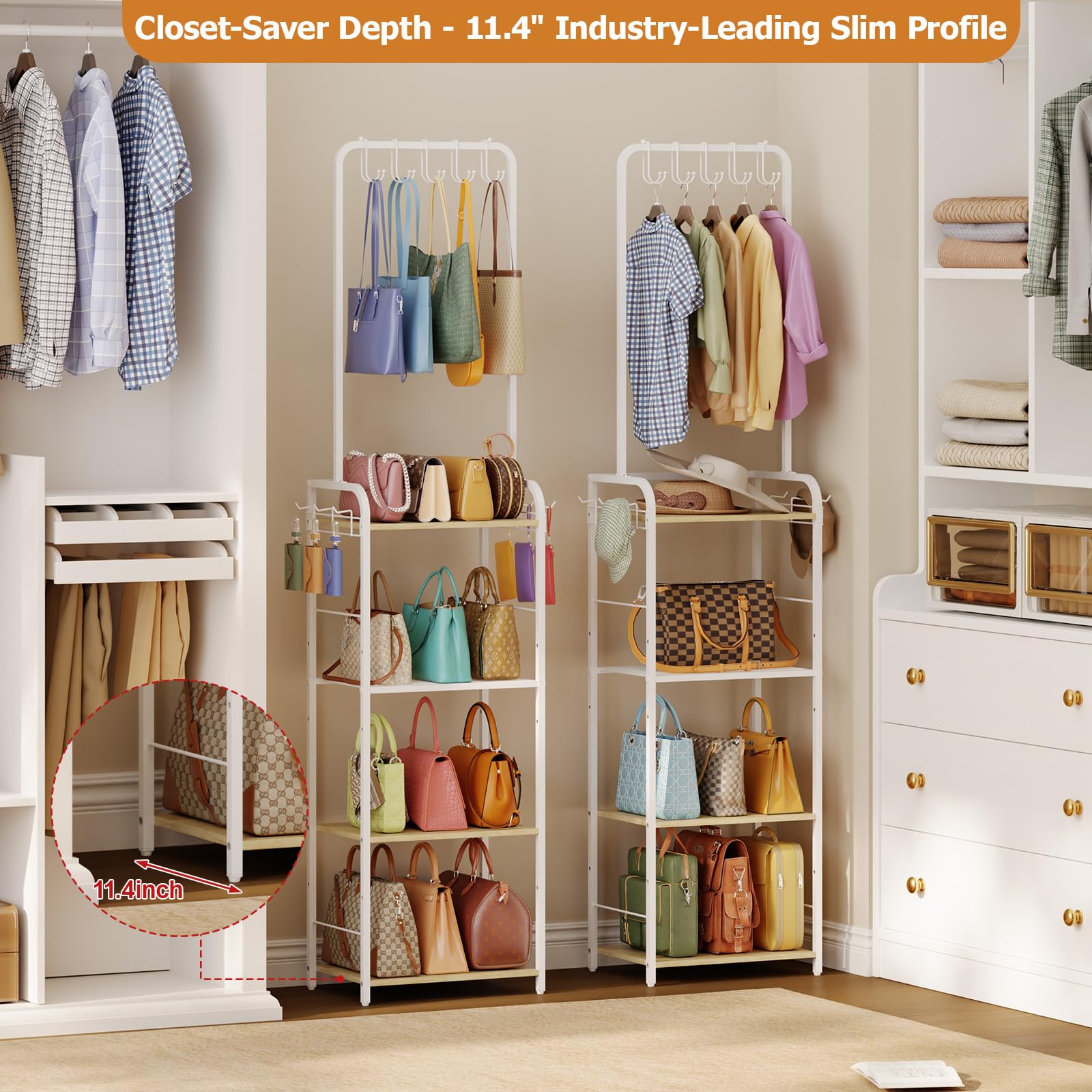 【Ultra-Slim for Tight Spaces】 Slim narrow 11.4" depth fits narrow corners, closets, bedrooms or entryways; maximizes storage in small apartments without crowding – ideal closet organizer for handbags & totes