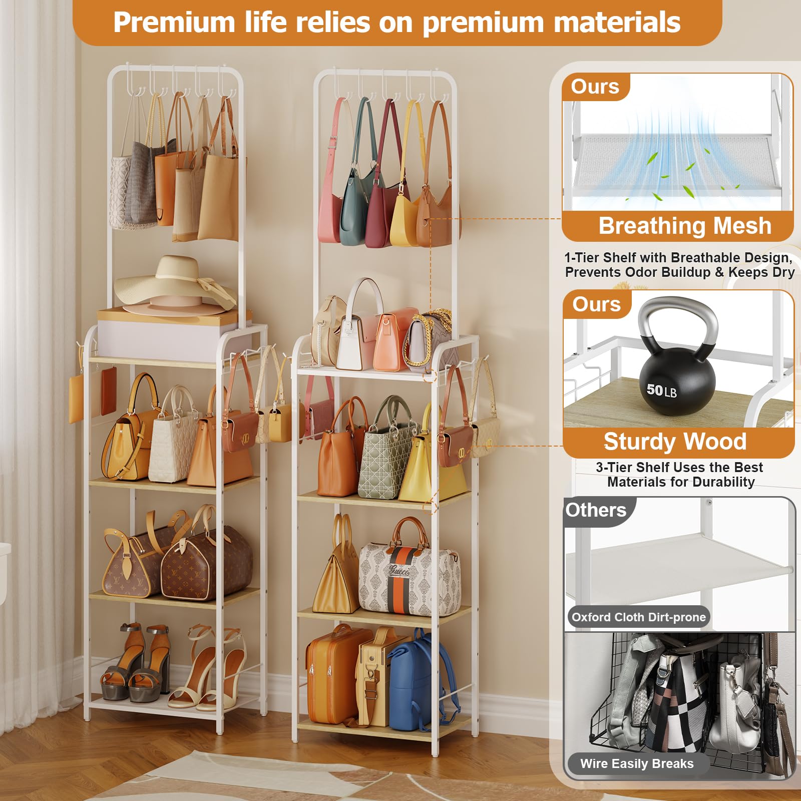 【Premium Materials for Lasting Use】 Strong metal frame + solid wood shelves + breathable mesh for durability & airflow; easy to clean (unlike dirt-prone Oxford cloth) & no sagging (unlike cheap wire) – reliable bag storage organizer keeps collection fresh