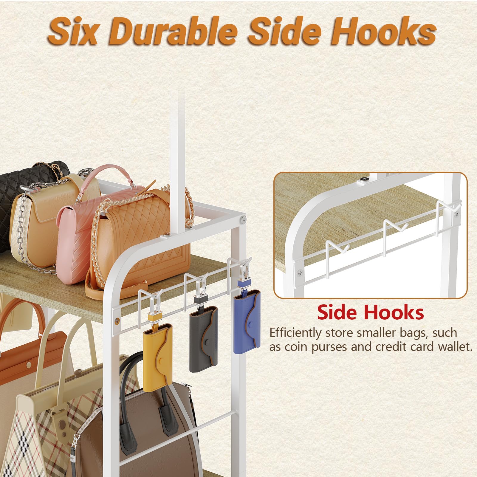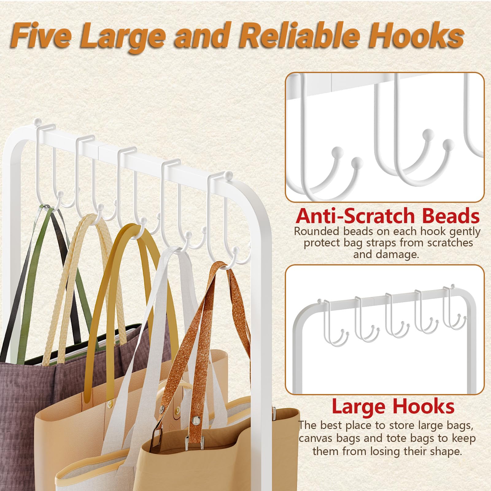 【High-Capacity with Smart Hooks】 5 large anti-scratch beaded hooks protect big tote straps + 6 durable side hooks for wallets & small bags; holds multiple handbags, backpacks & purses for easy daily access