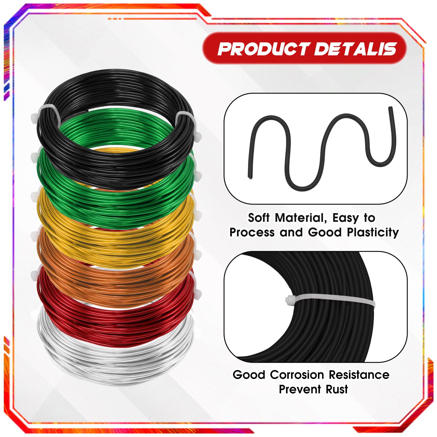【ALUMINUM CRAFT WIRE SIZE】: 9 Gauge(3mm) in thickness, 33 Feet (10m) in length 6 rolls of different color aluminum wire(Gold、Silver、Black、Grass Green、Golden Yellow、Red Wire)