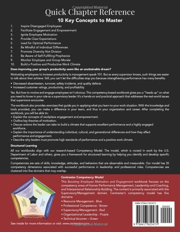 Winner - 2022 Global Book Awards: AWARD FINALIST / Workplace Culture Does improving your group’s productivity seem like an unattainable dream? Motivating employees to increase productivity is management speak 101. But as every supervisor knows, such things are easier to talk about than achieve. Still, you can’t let the difficulties stop you because strengthening performance has many benefits: Decreased absenteeism, turnover, safety incidents, and quality defects Increased customer ratings, productivity, and profitability Yes. But how to motive and engage employees isn’t obvious. This competency-based workbook gives you a “heads up” on what you need to know in your role as a supervisory leader. It’s a hands-on and practical approach that addresses the real-world issues that supervisors encounter. The workbook also provides exercises that guide you in applying what you learn to your work situation. With the knowledge and tools provided, you can make a difference in your team, and thus in your organization and career. Finally, to tweak your memory as you work with employees, the workbook gives you a “recap checklist” of the key points to keep in mind. After completing this workbook, you will know how to: Explain the concepts of workplace engagement and empowerment. Outline key theories of motivation. Discuss actions the leader can take to build a climate that supports excellent performance and a highly engaged workforce. Explain the importance of understanding individual, cultural, and generational differences and how they affect performance and engagement. Describe why leaders must promote high standards of performance and a positive work climate. 10 Key Concepts to Master Inspire Disengaged Employees Facilitate Engagement and Empowerment Ignite Employee Motivation Provide Clear Expectations Lead for Optimal Performance Be Mindful of Individual Differences Promote Diversity Not Division Be Aware of Self-Fulfilling Prophecies Monitor Employee and Group Morale Build a Positive and Productive Work Climate Structured Learning All our workbooks align with our research-based Competency Model. The model, which is rooted in work by the U.S. Department of Labor and others, gives you a framework for structured learning by helping you identify and develop specific competencies. Competencies are sets of skills, knowledge, attitudes, and behaviors that are observable and measurable. Our model has 35 competency dimensions associated with successful performance in leadership and professional roles. Competencies are clustered into five domains that may overlap. This Boosting Employee Motivation and Engagement workbook focuses on the competency areas of Human Performance Management, Leadership and Coaching, and Interpersonal Relationship Building. The workbook content is primarily associated with the Supervisory/Management competency cluster or domain. For more information or visit: www.centrestar.com Best of all? You can take any course: Online at your own pace through Centrestar and earn CEUs or PDHs: www.centrestar.com Select workbook materials through Amazon and conduct your own customized inhouse training Arrange to have any or all sessions instructor led via remote platform for your organization by the Pennsylvania College of Technology: call: 570.327.4775 or email: [email protected]