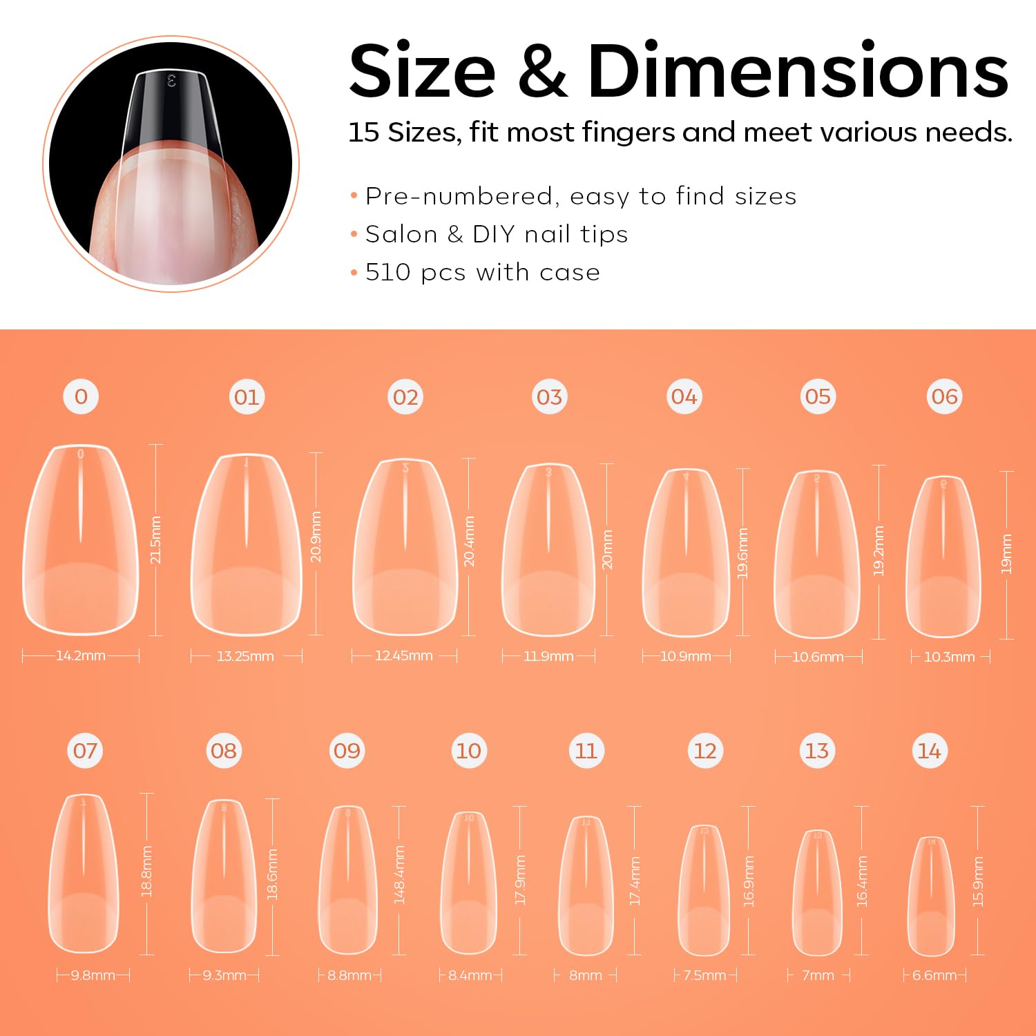 Varied Size: Modelones nail extension set include 510 pcs short coffin nails tips, 15 different sizes with with 34 pieces of each size, clearly numbered from 0 to 14. Easy to choose the suitable size for every finger