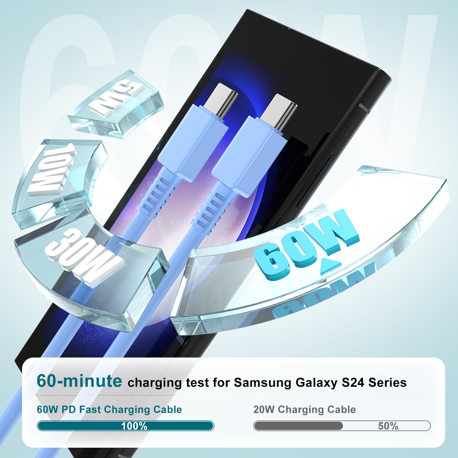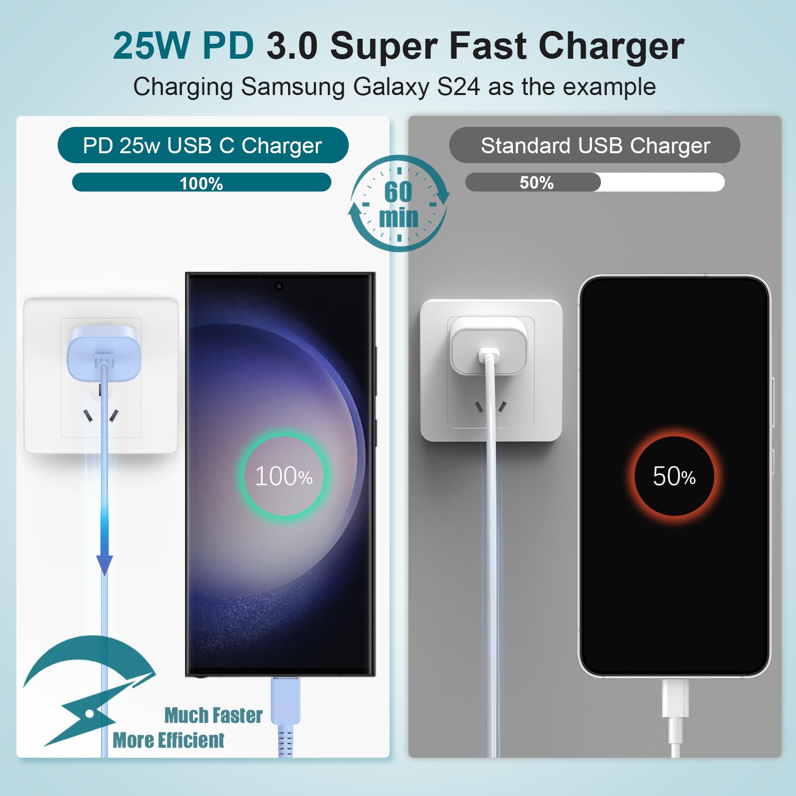 PD25w Samsung Super Fast Charger - 25 watt Type C charging block for samsung phones & 10ft samsung charger fast charging cord, charges Samsung Galaxy S25/S24/S23 from 0 to 100 percent in about 60 min or full charges iPad Pro 12.9 inch in 2 hours. It is 5 times as fast as standard fast charger usb c, 10 times as fast as PC USB port and saves your time.