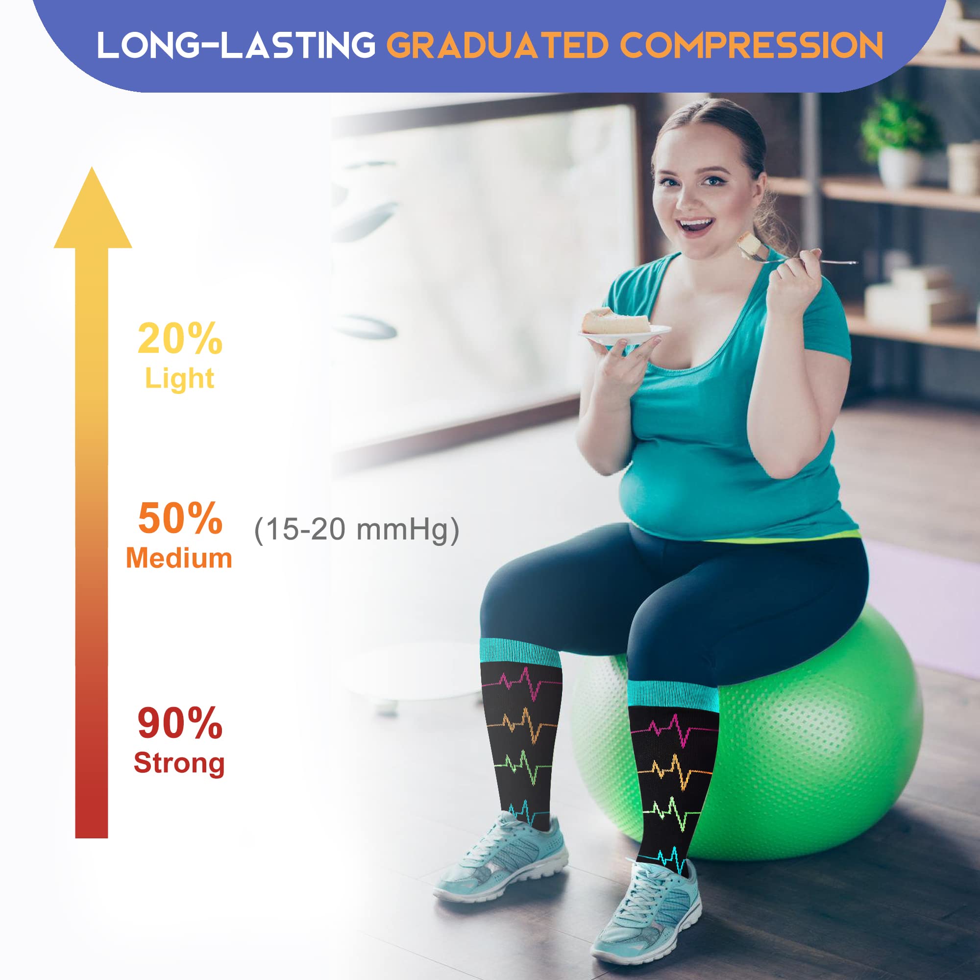 Plus Size Compression Socks Wide Calf: These wide calf compression socks are designed for people with wider calves, providing excellent leg support and long-lasting graduated compression. They are easy to put on and take off and won't roll down or cut into your leg due to their 360° stretchy and wide cuff. They are also durable and comfortable to wear.